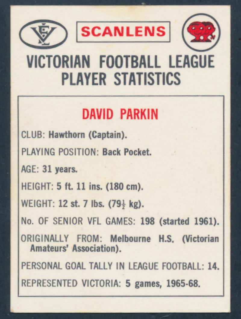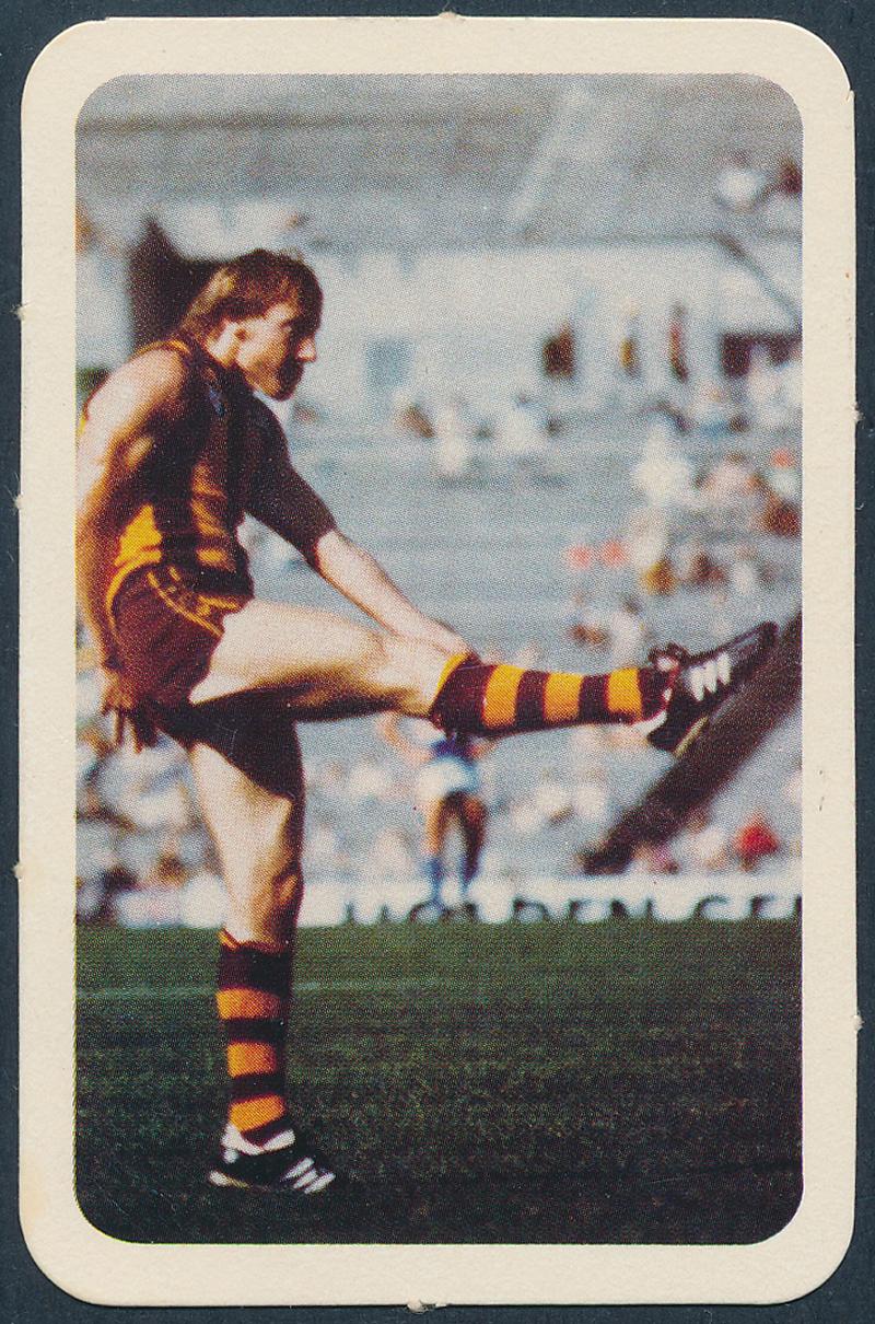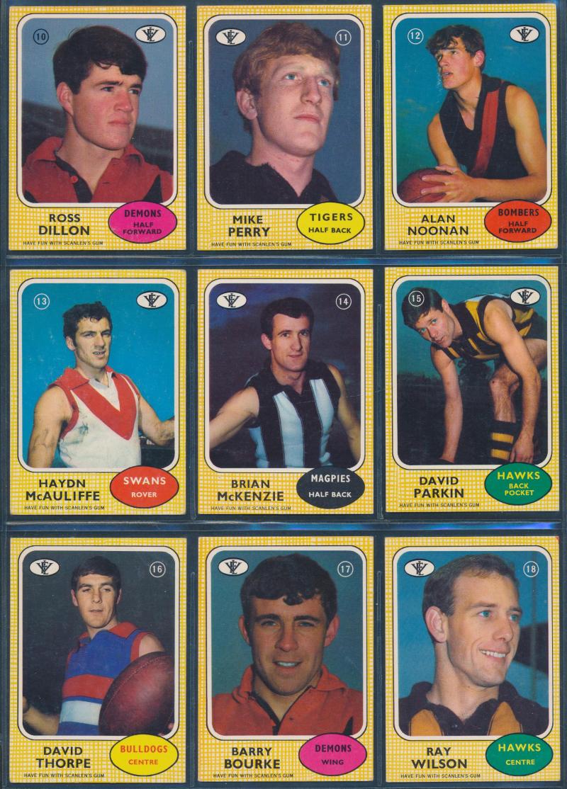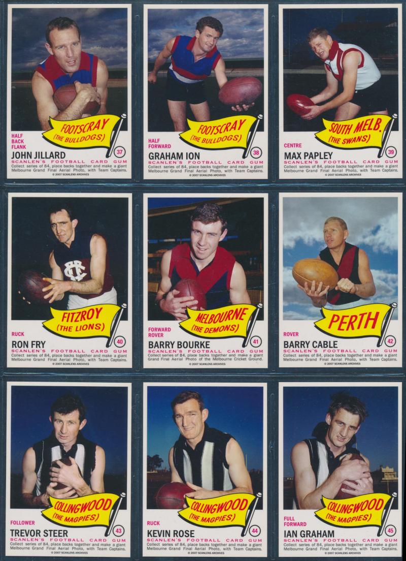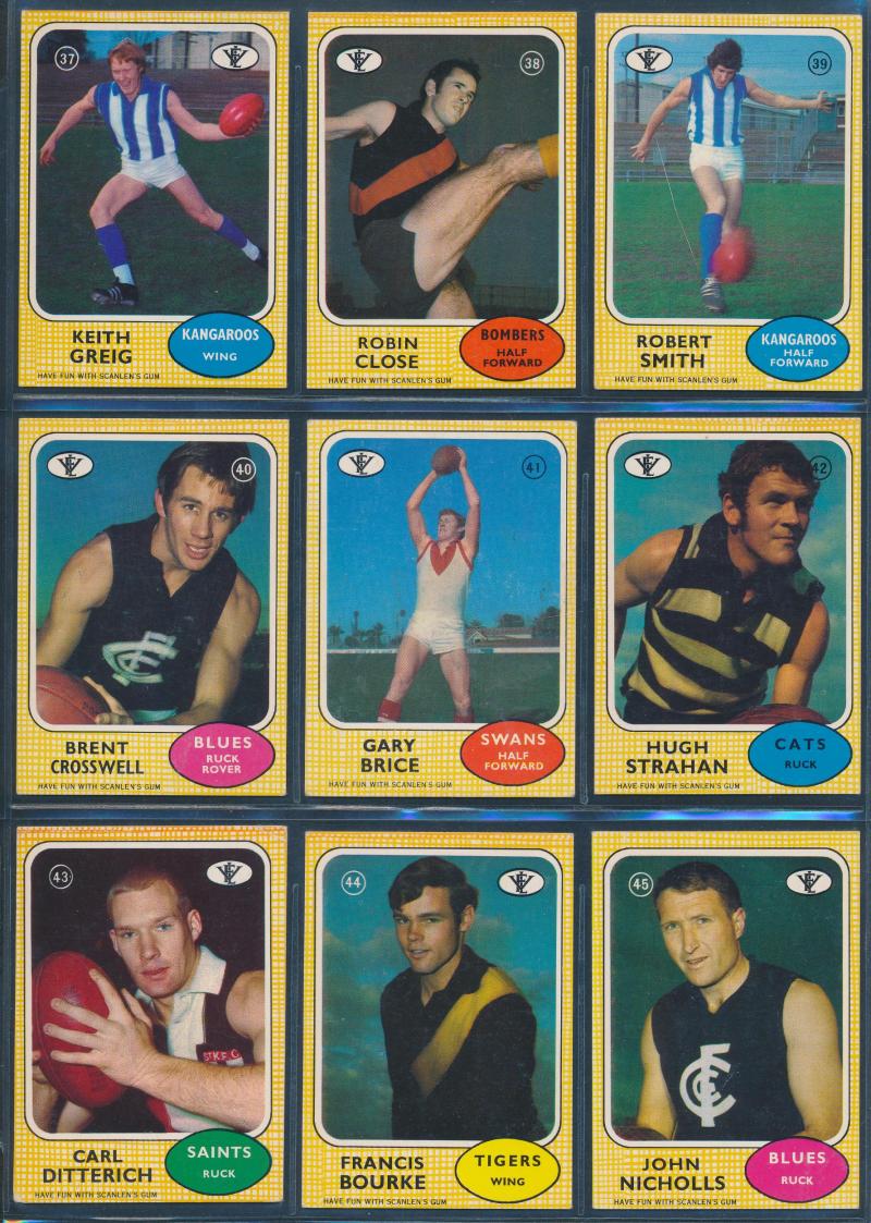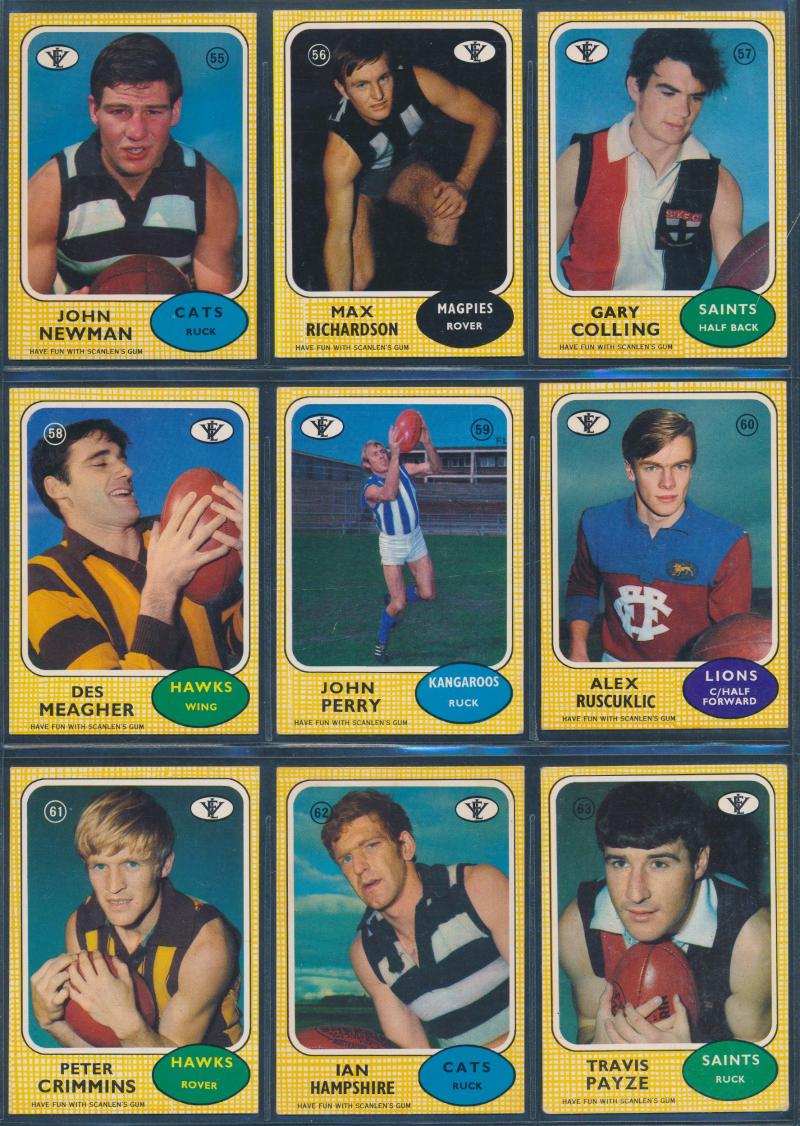Essendon (10), Footscray (18), Geelong (1), Hawthorn (18) including rare Gary Ablett Sr Rookie card, Melbourne (19), North Melb (27), Richmond (1), South Melb (15) & StKilda (2), mainly Fine/Very Fine.
