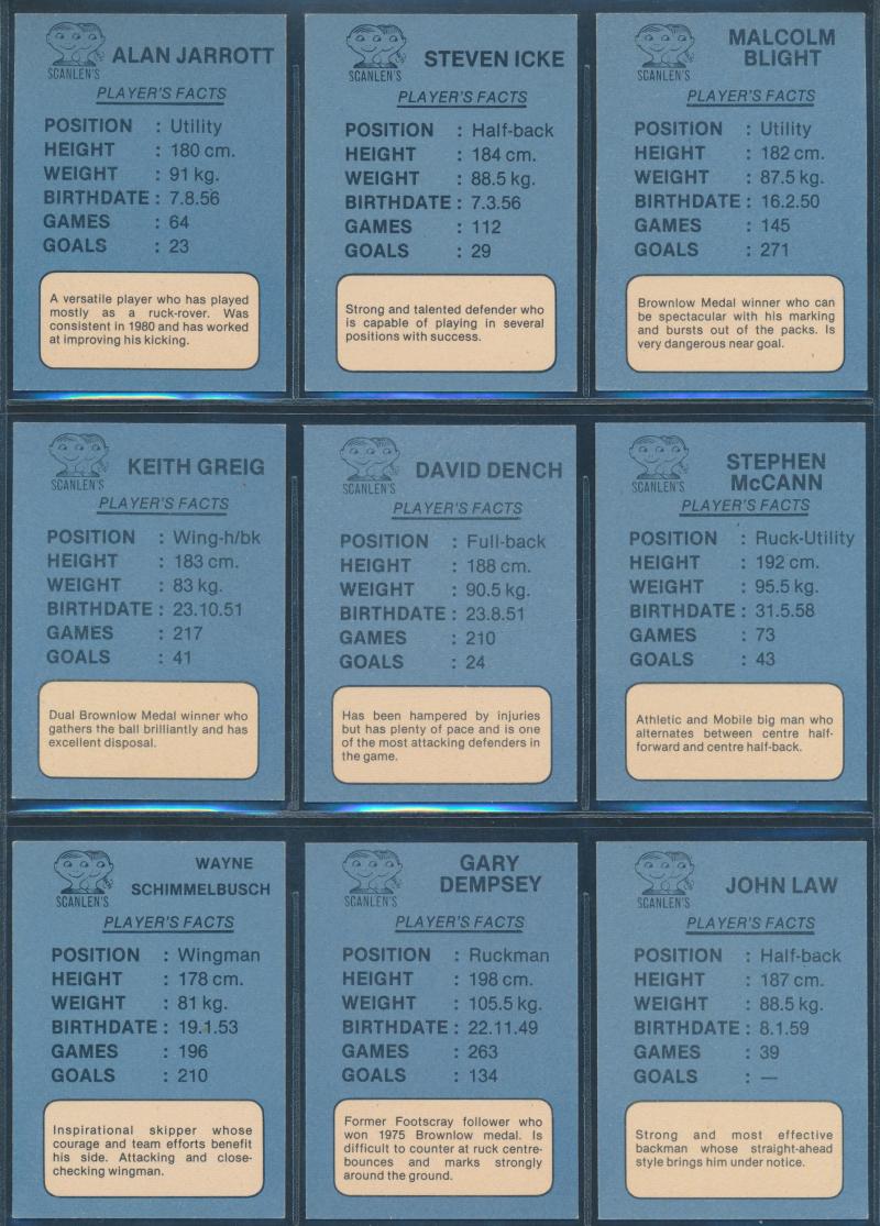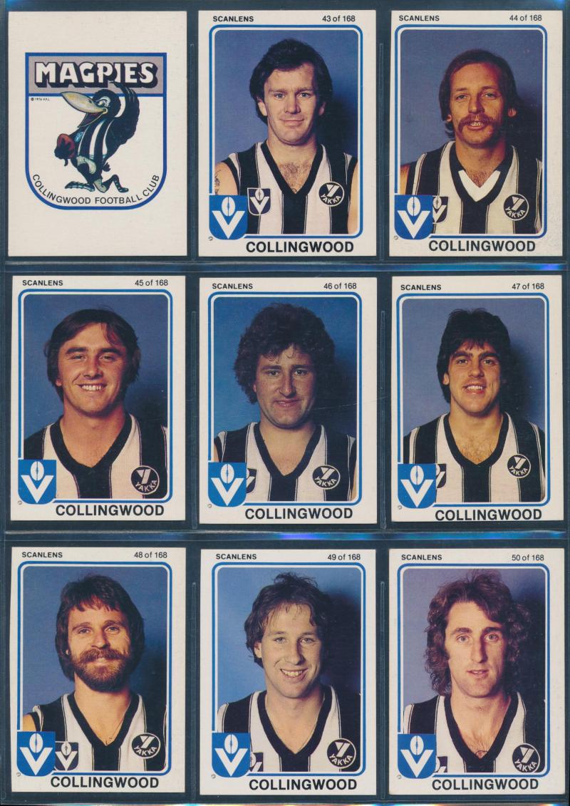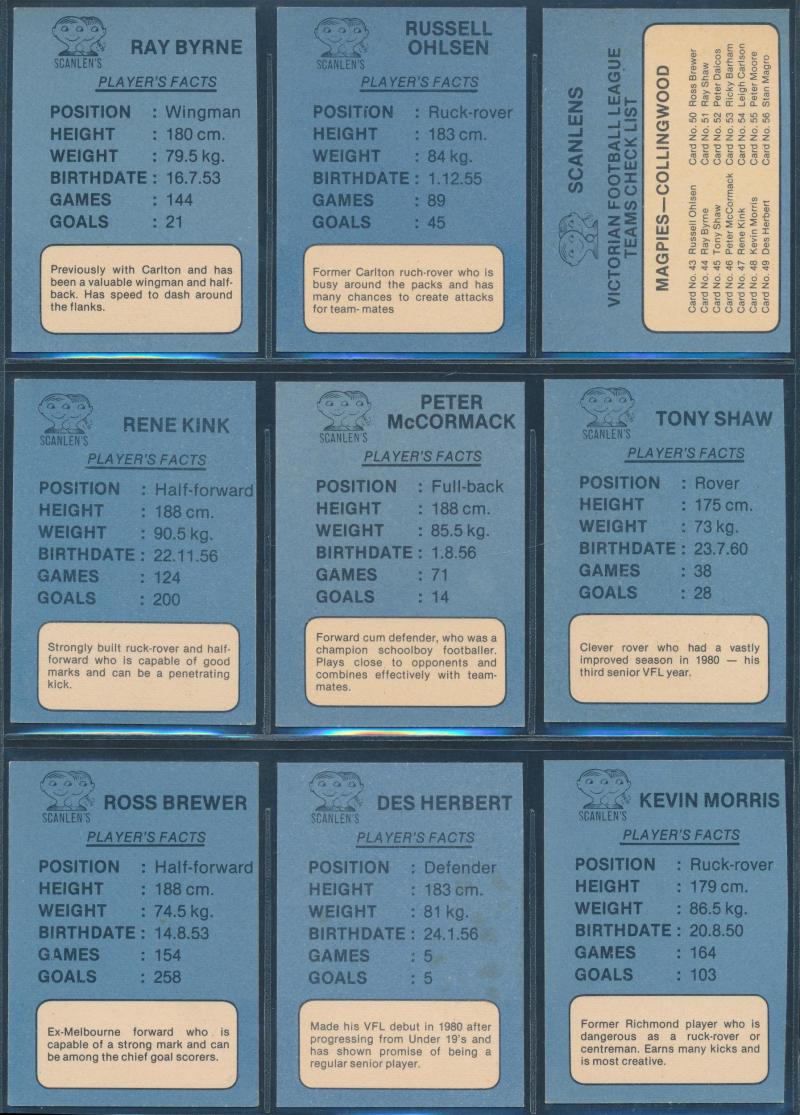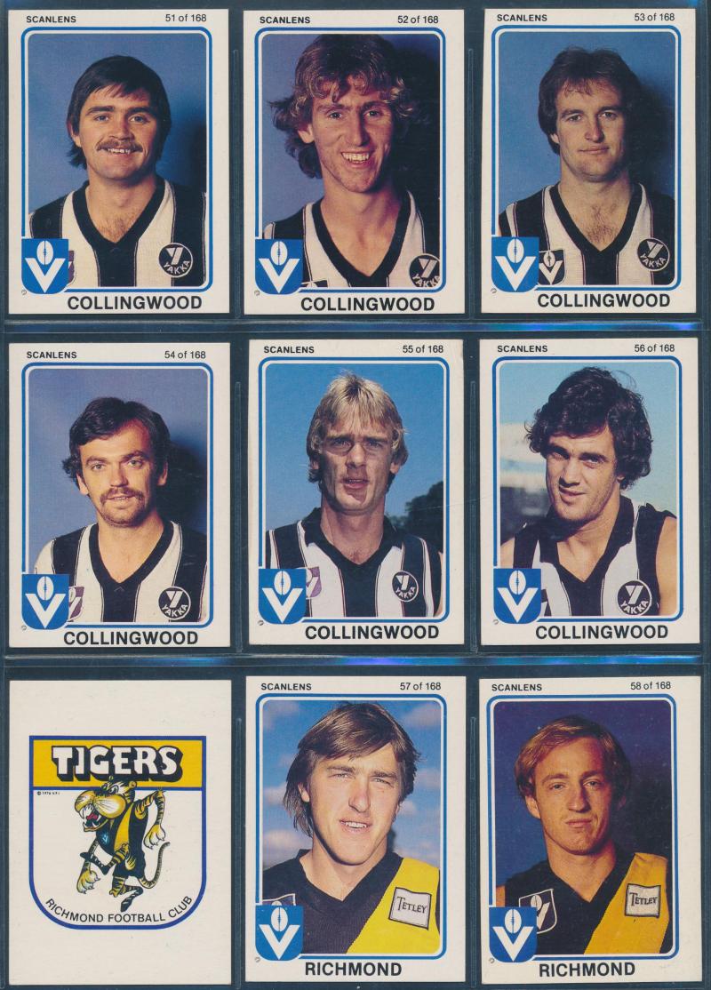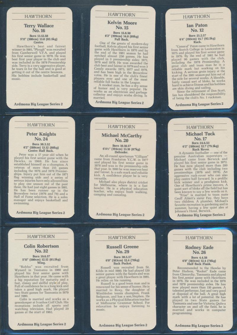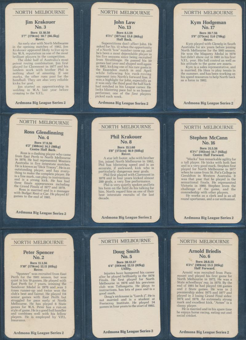1981-82 Ardmona 'Big League Series 1' for Essendon (4), Melbourne (1) & North Melb (3); 'Big League Series 2' for Collingwood (18),