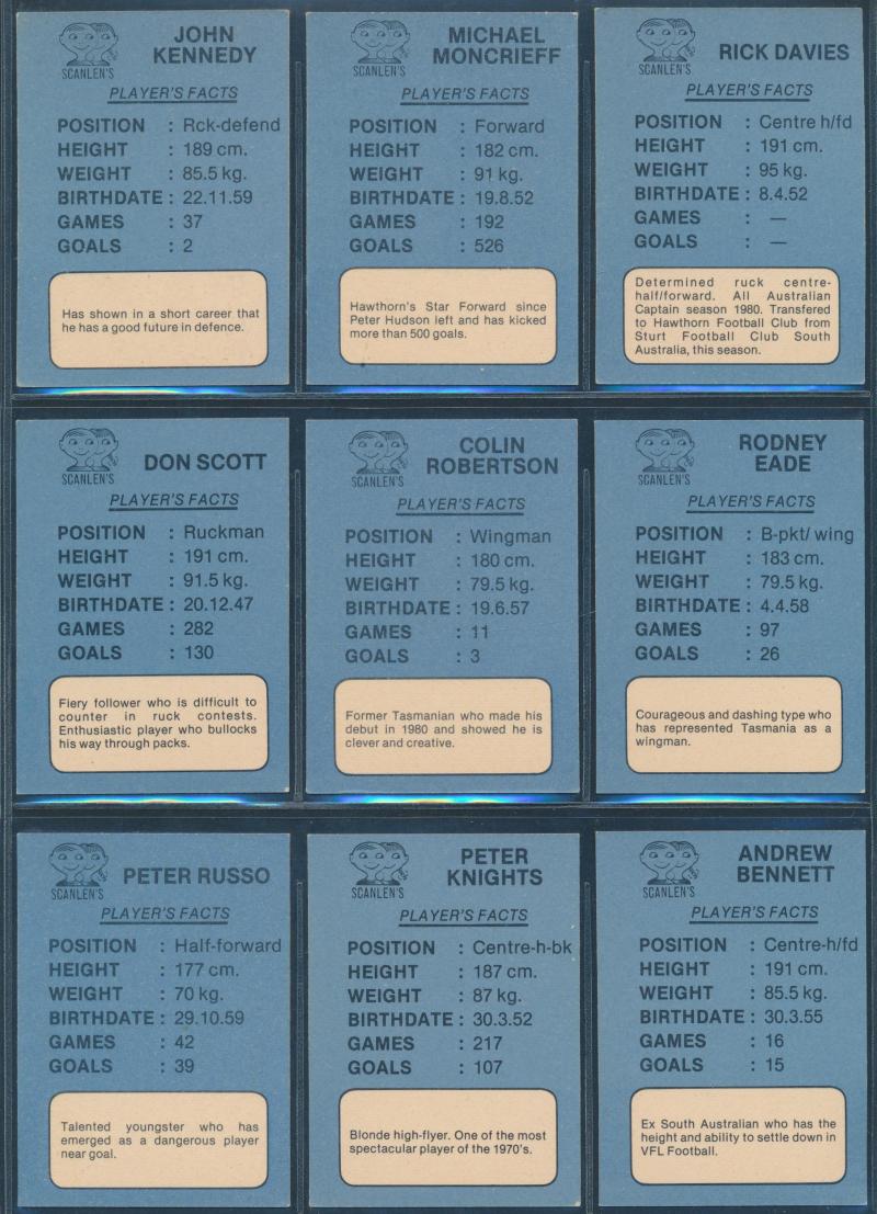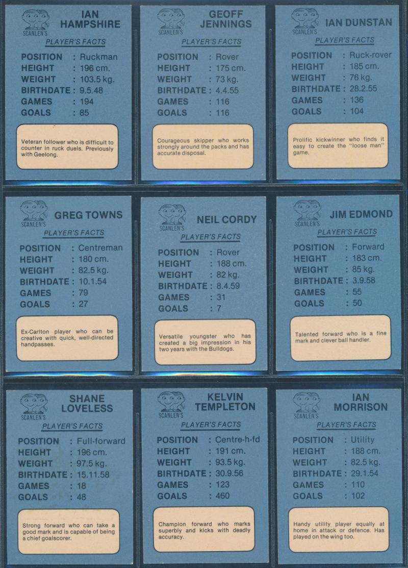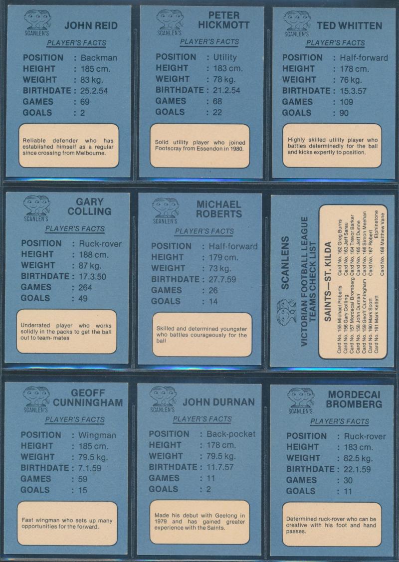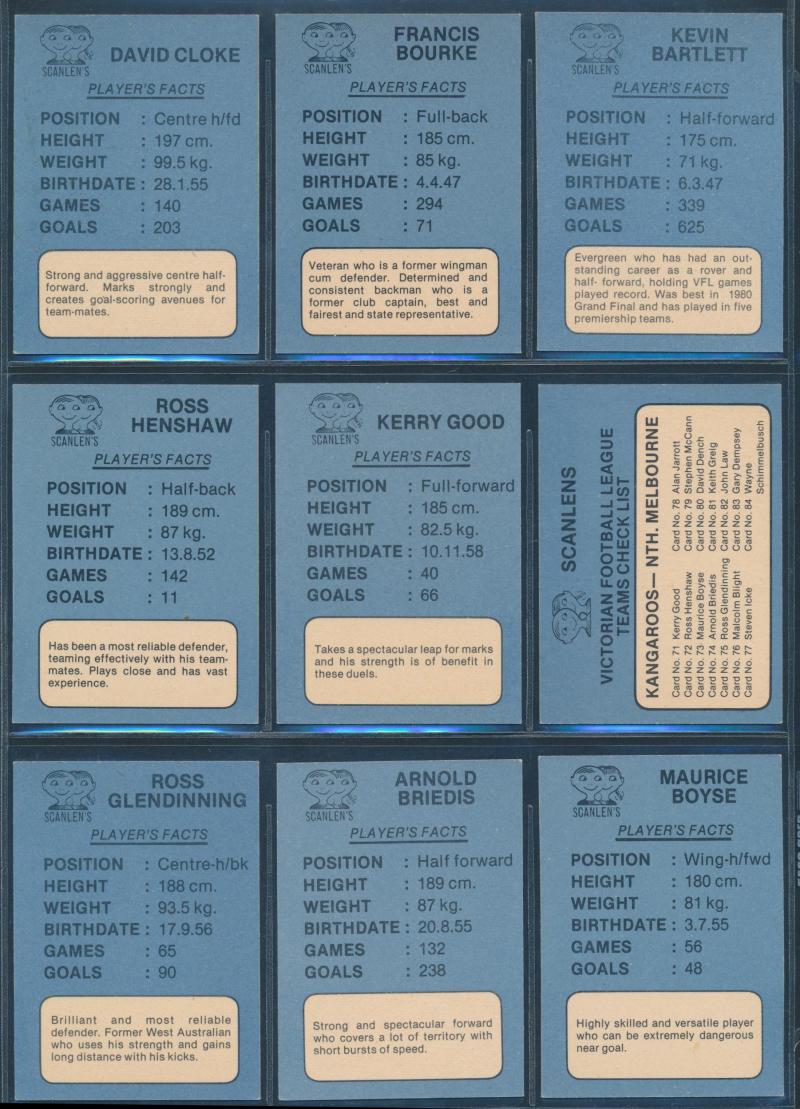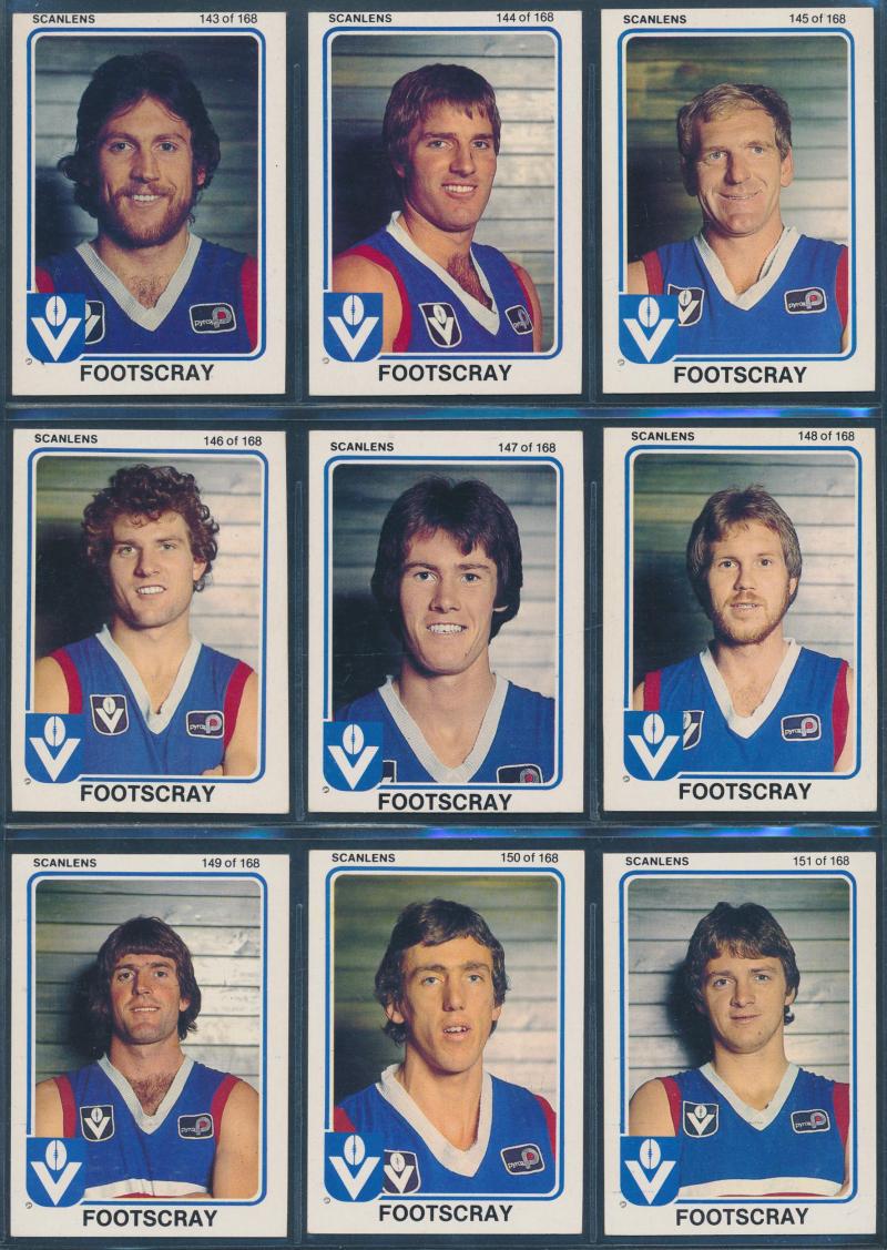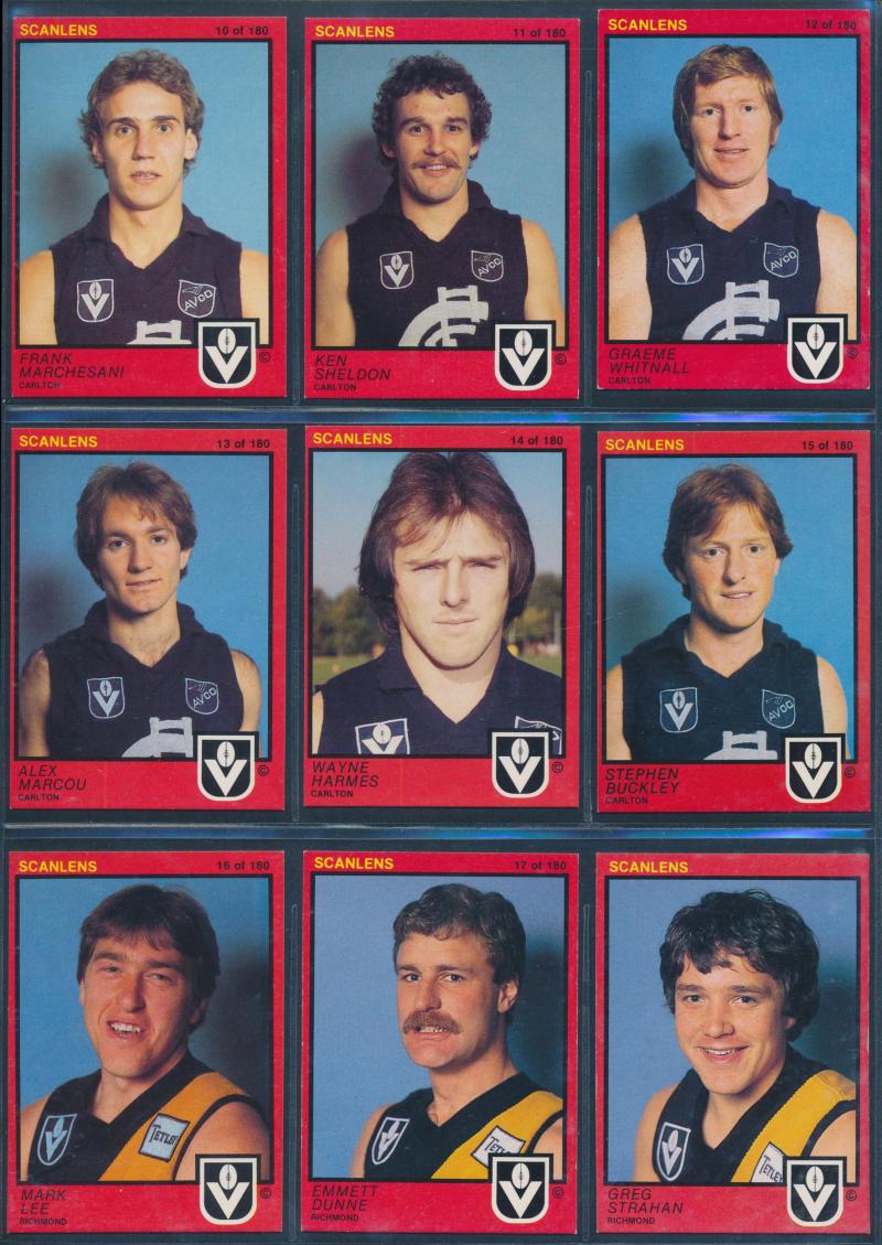 1981-82 Ardmona 'Big League Series 1' for Essendon (4), Melbourne (1) & North Melb (3); 'Big League Series 2' for Collingwood (18),