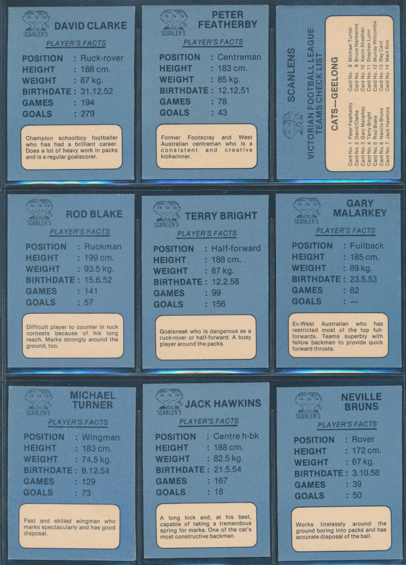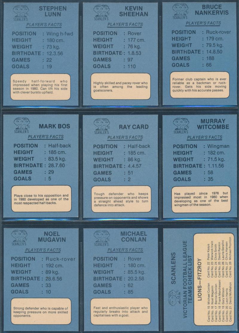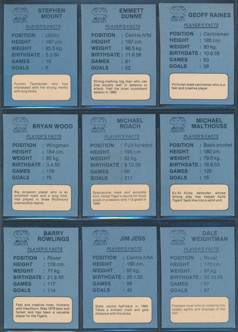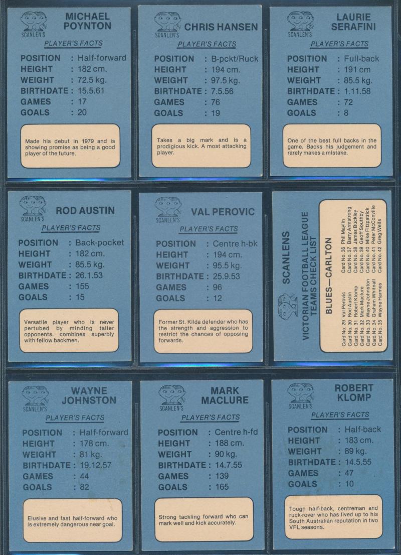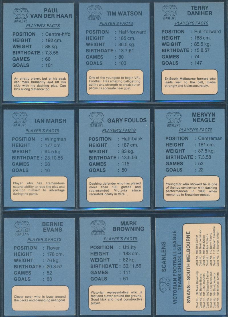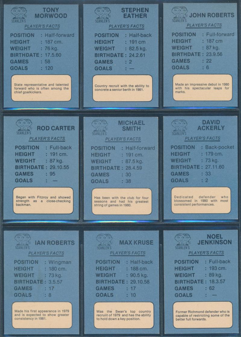 1981-82 Ardmona 'Big League Series 1' for Essendon (4), Melbourne (1) & North Melb (3); 'Big League Series 2' for Collingwood (18),