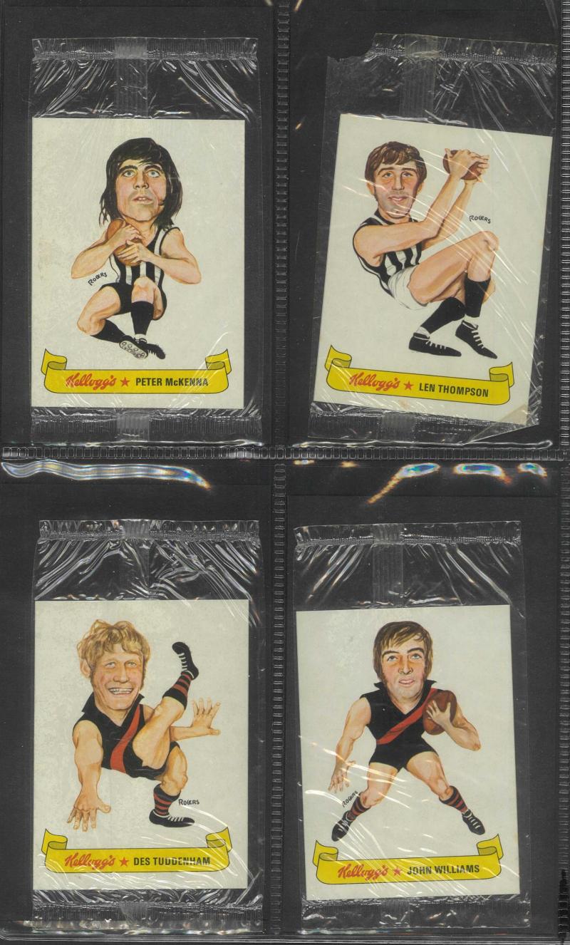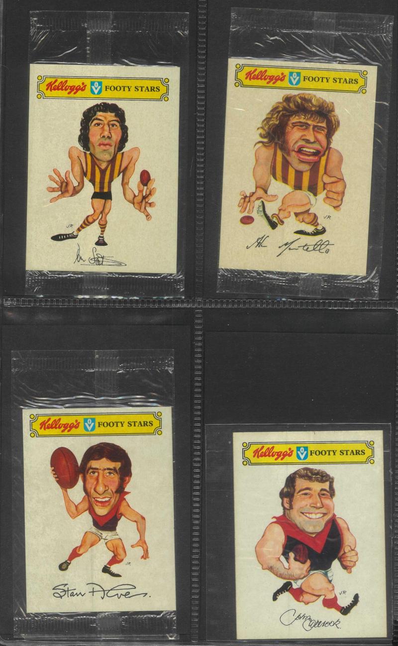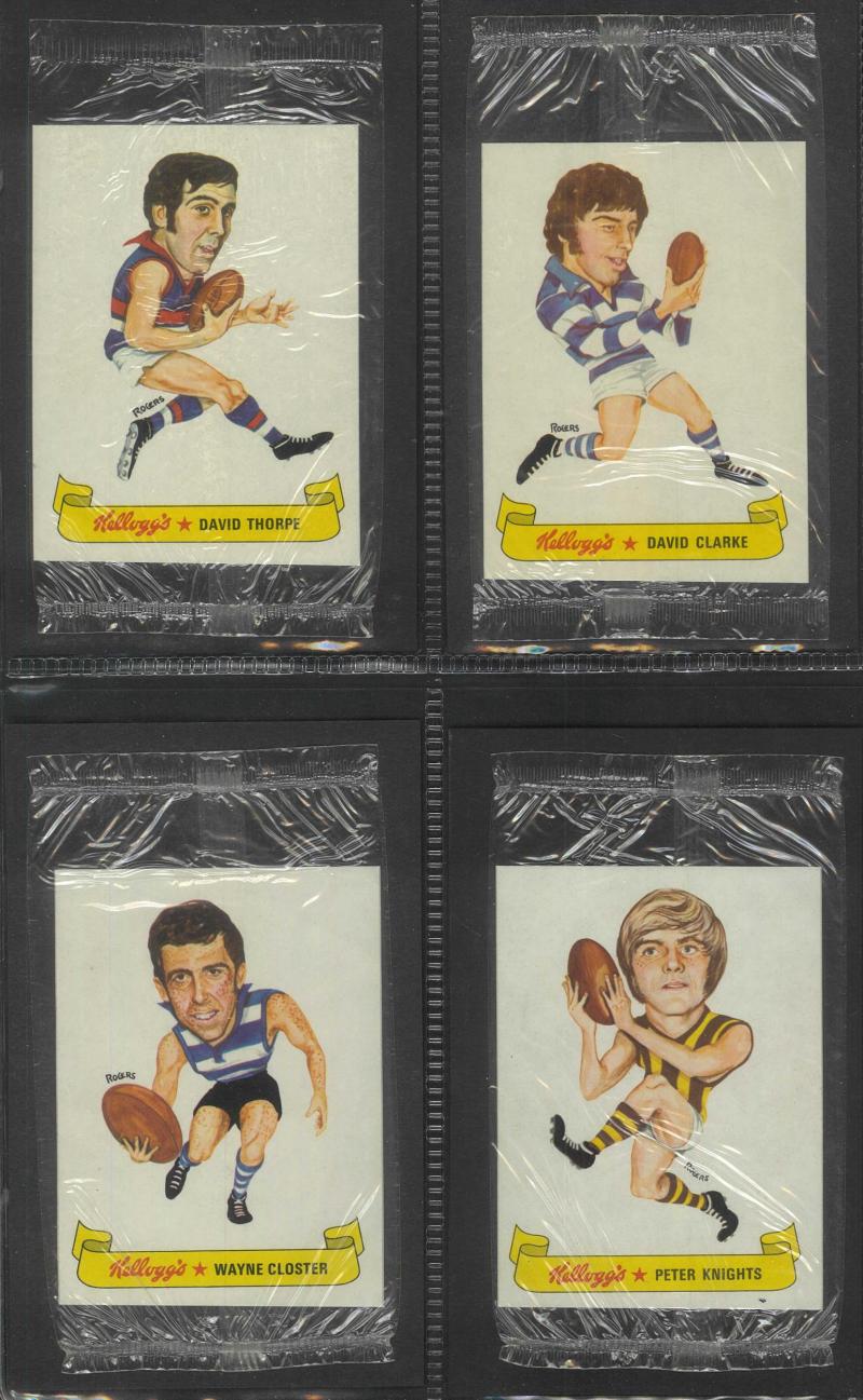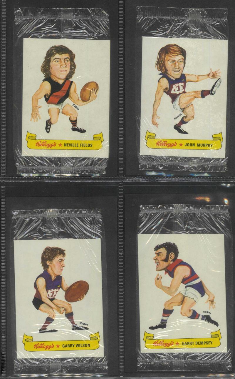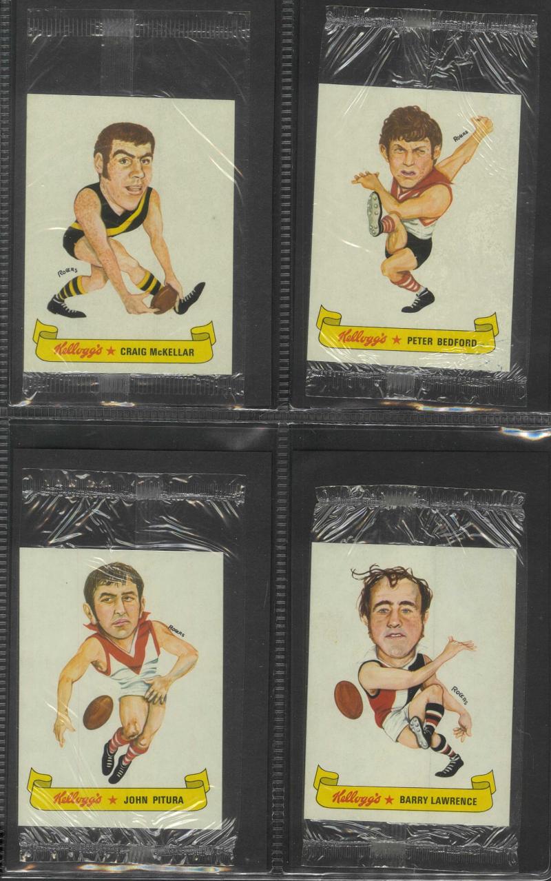 1974 Kelloggs 'Australian Football Caricatures - Footy Stars', almost complete set [22/24], all in cellophane wrappers, mainly