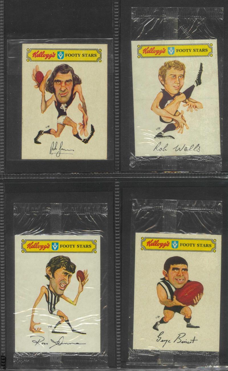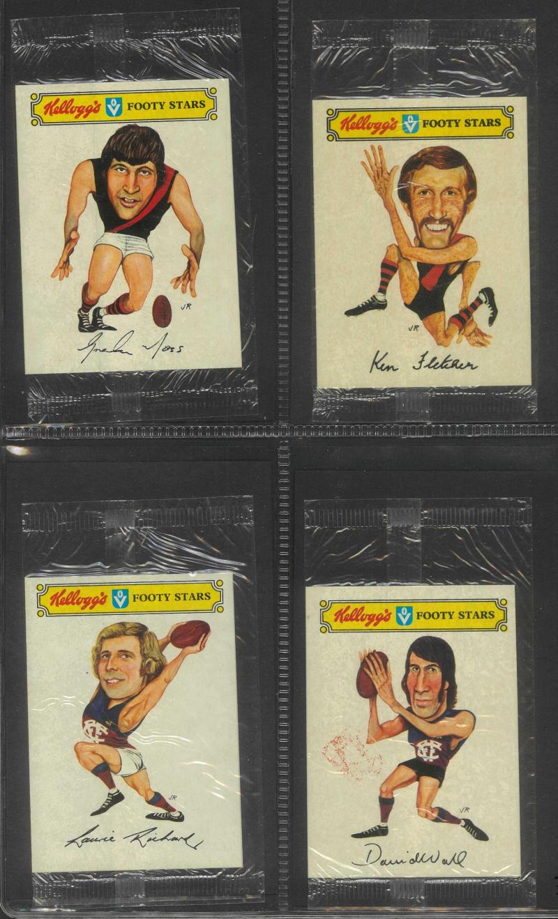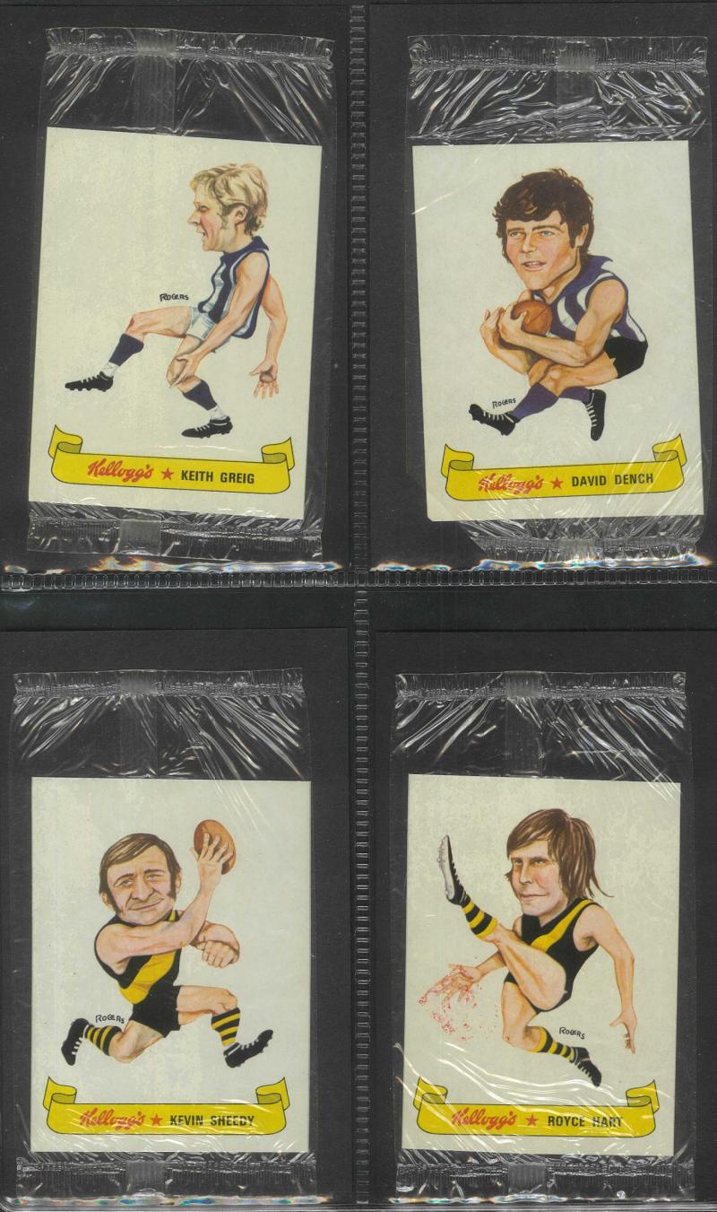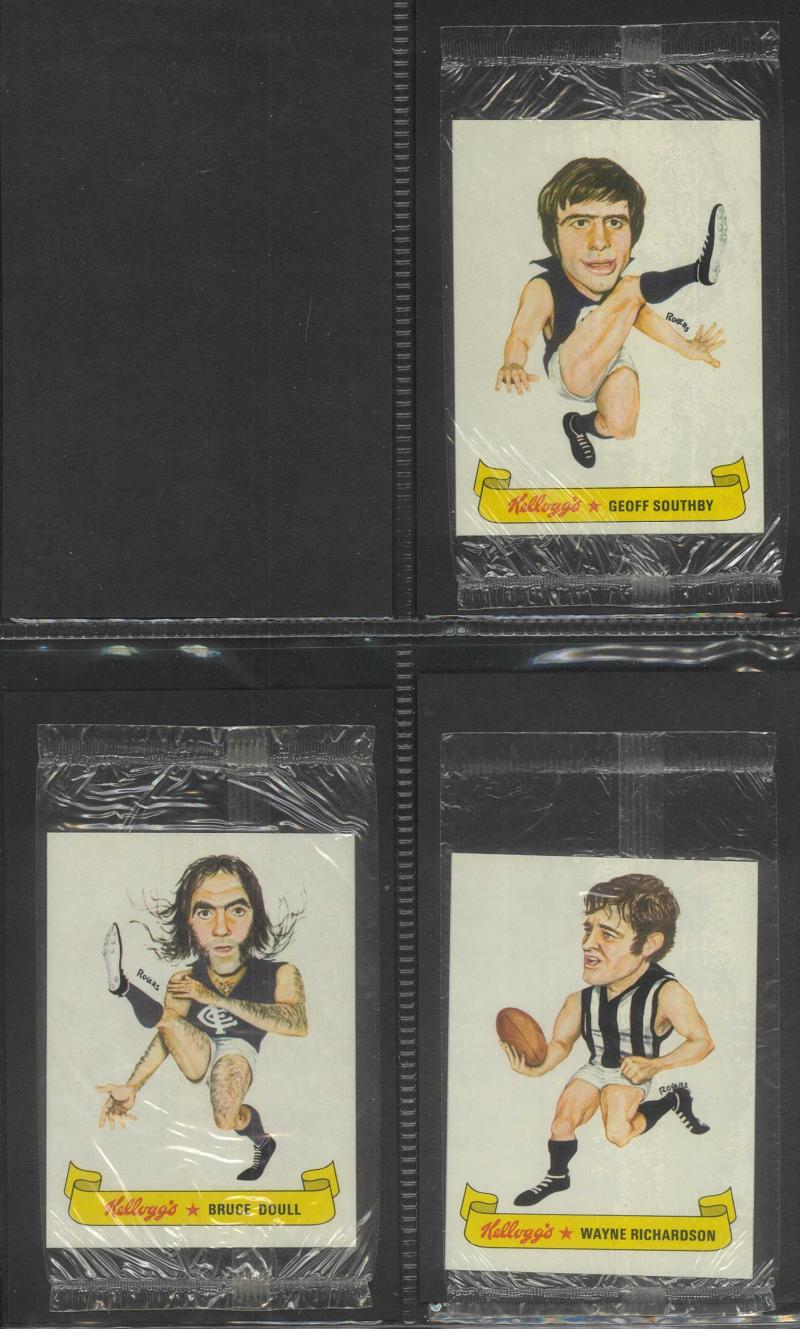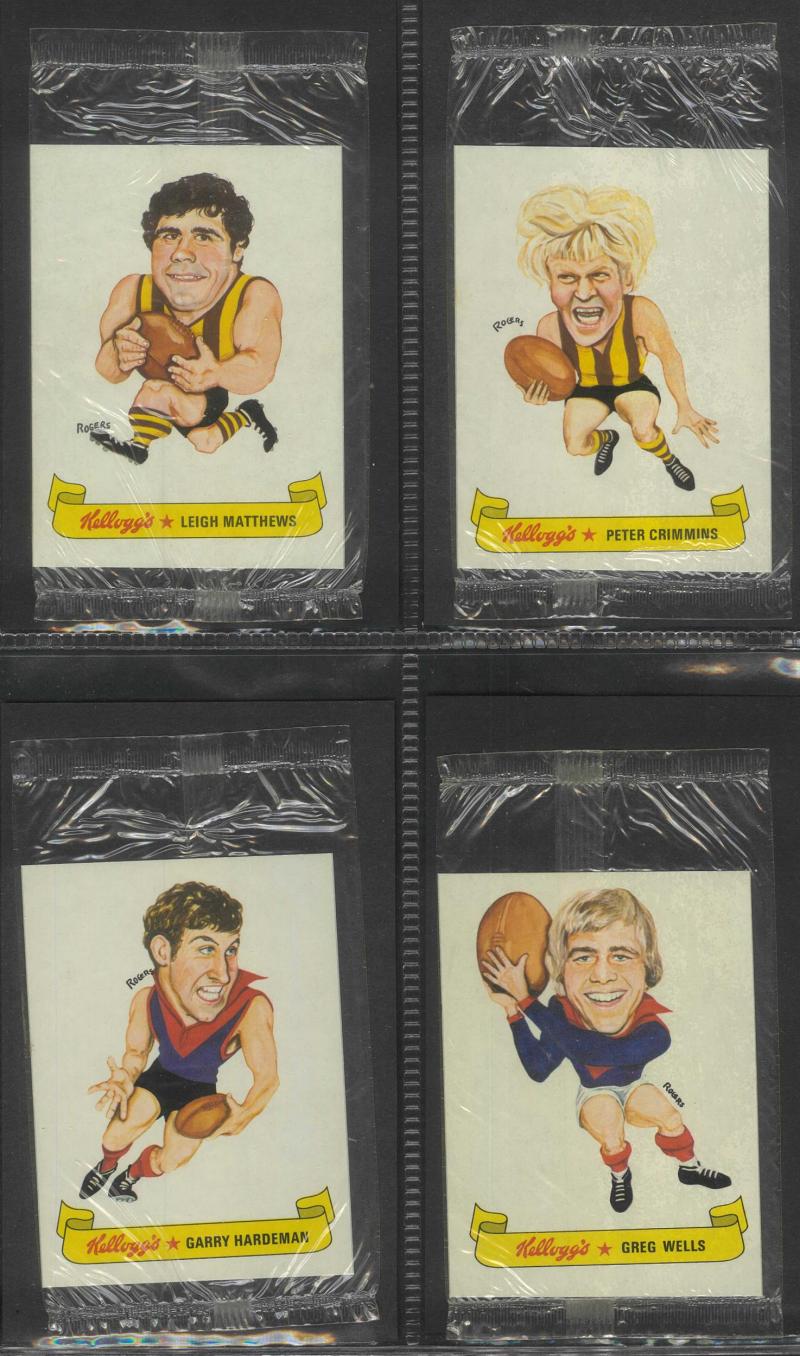 1974 Kelloggs 'Australian Football Caricatures - Footy Stars', almost complete set [22/24], all in cellophane wrappers, mainly