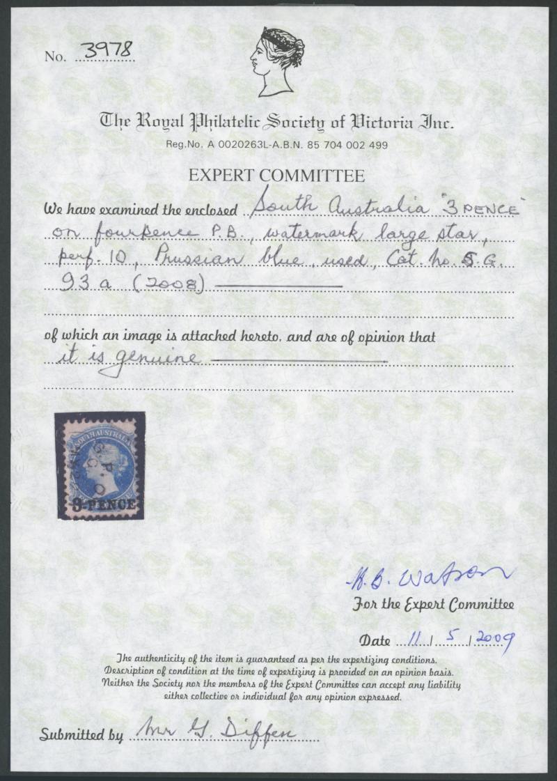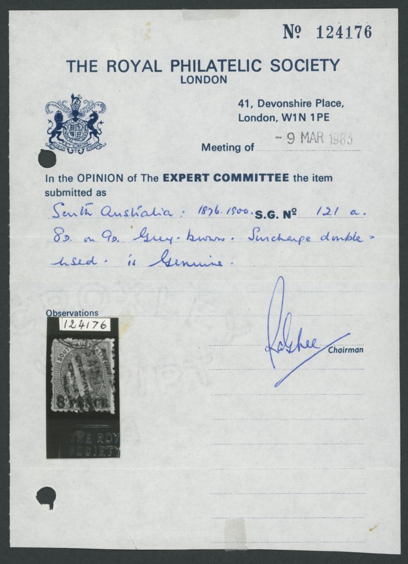 lower-right that has been folded over at one point and thus has a small crease, multiple light but slightly untidy Adelaide cancels, Cat £2500. RPSL Certificate (1965) issued to Lt Col GHC (Harry) Napier. Don Pearce's very fine example with the