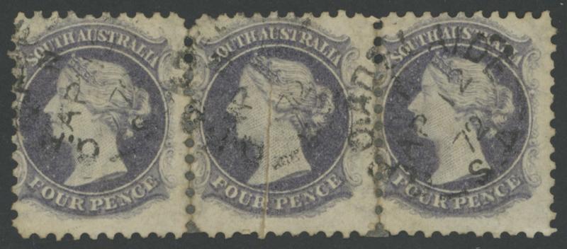 Watermark 'POSTAG...' across the three units, the central stamp with a minor Pre-Printing Paper Fold, 'GPO ADELAIDE/AP12/72/SA', Cat £1050+ for singles. The equal-largest recorded multiple. Much better-centred than Don Pearce's strip of 3 - the first