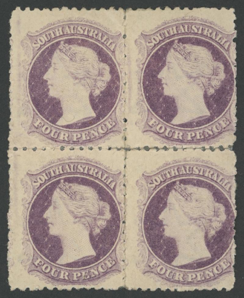 shade, irregular perfs at left, large-part gum, Cat £760+ for singles. A very attractive and desirable block. Ex Don Pearce: sold for $1555 (Sale 245 Lot 550). Almost as fine as Michael Blake's block of 4 that sold for $4893 (Sale 188 Lot 1277). (Image1) (Image2)