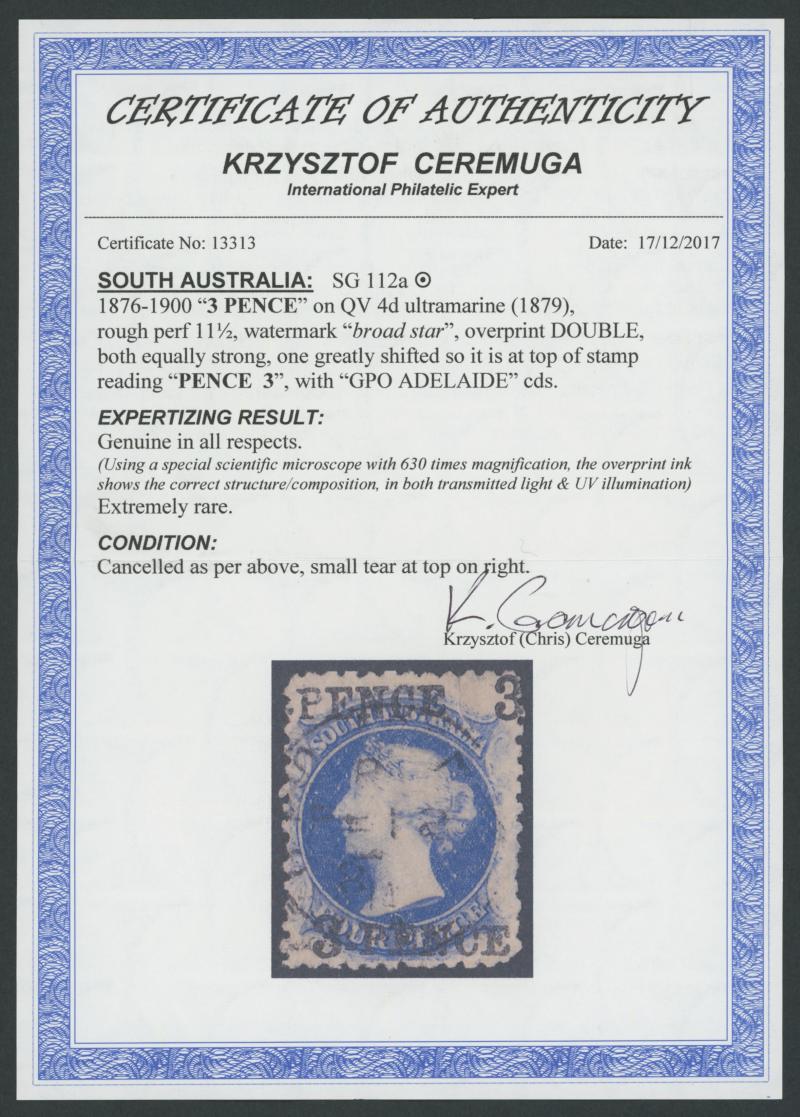 characteristically with the second overprint at the top, small closed tear at upper-right, framed GPO cds, Cat £2500. Georg Buhler (1988) and RPSV (1999) Certificates. Don Pearce's very fine example sold for $3595 (Sale 249 Lot 1201). (Image1) (Image2)