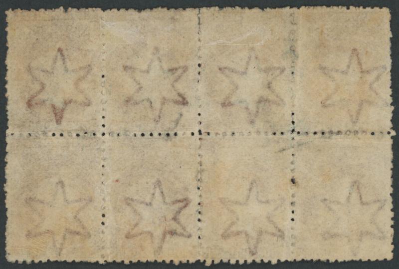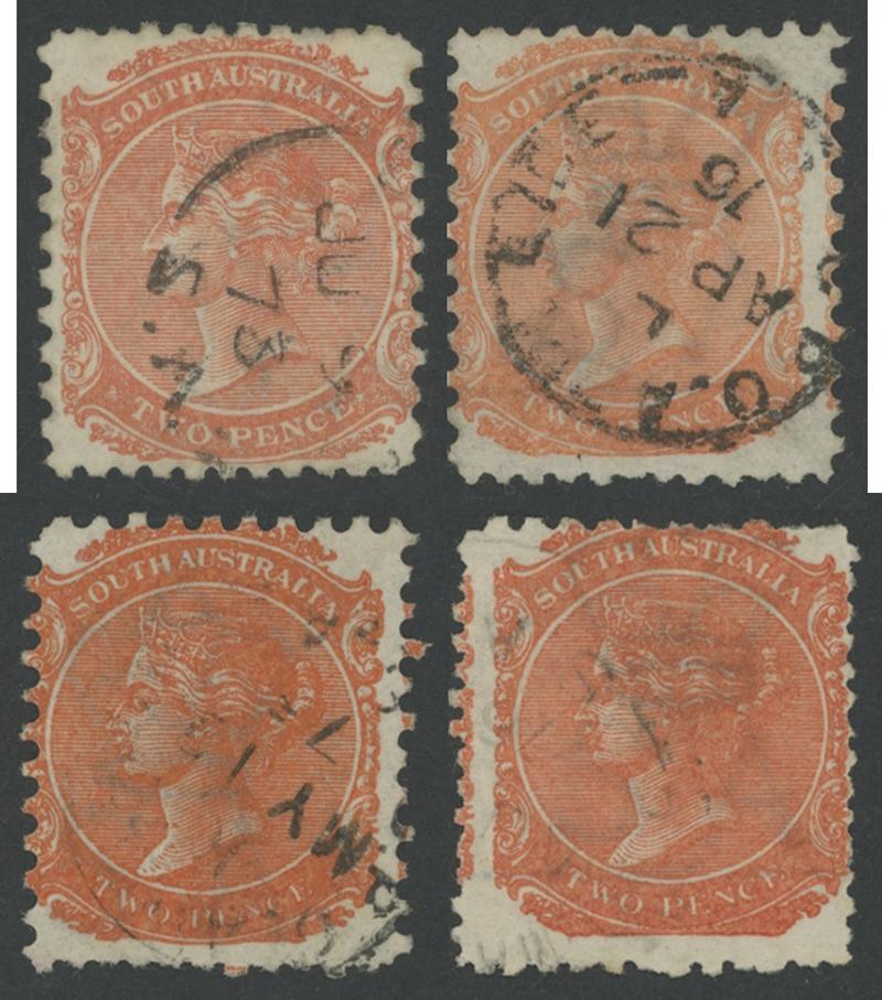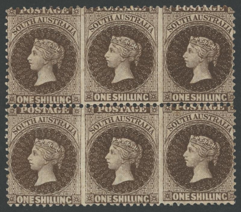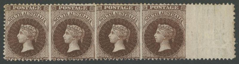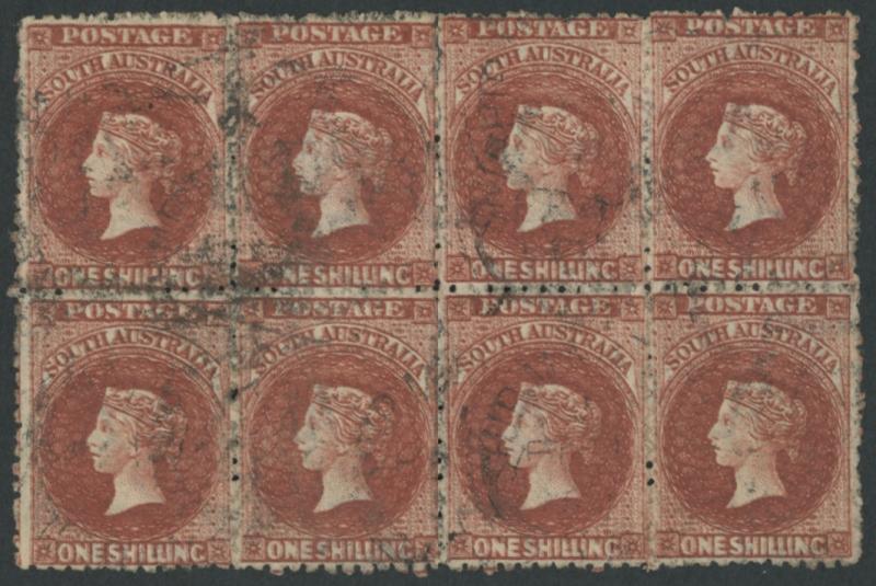 of 8 (4x2), generally very well-centred, multiple poor and mostly light strikes of the 'SHIP MAIL ROOM/ADELAIDE' cds. Rare and remarkably fine parcel usage. Ex Gary Diffen: sold for £312. (Image1) (Image2)