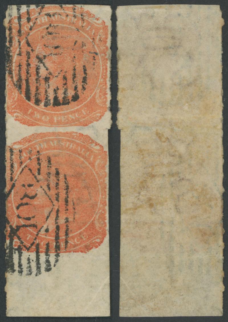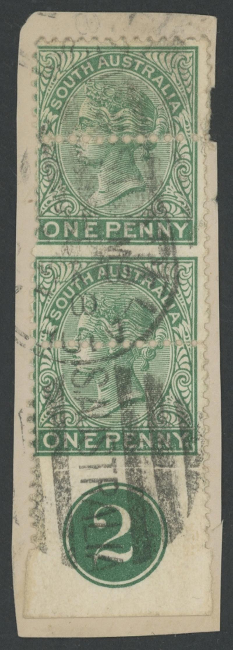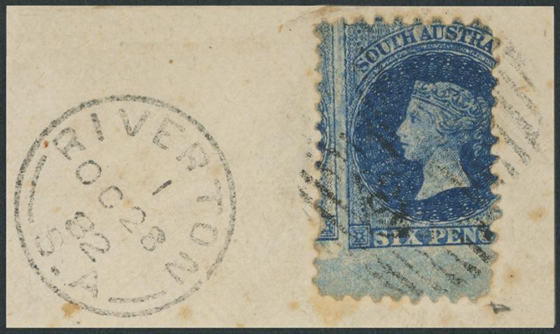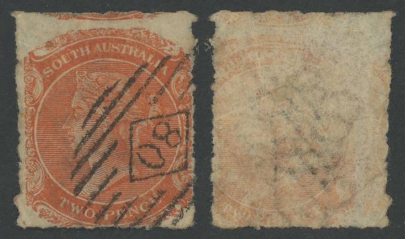 'reverse' is very light & upright relative to the 'face', full rouletting, creased, superb '80' cancel of Port Lincoln, Cat £750. Ex Don Pearce: sold for $1135 (Sale 249 Lot 1255). Rare: only one other example known to us, plus two overprinted 'P.'