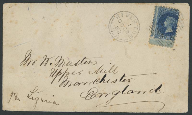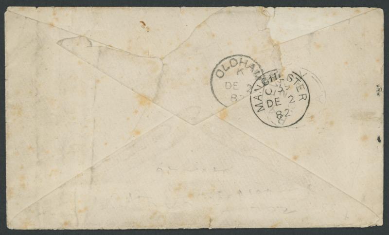 England "Per Liguria", fair '33' cancel & framed 'RIVERTON/ 1 /OC28/82/S.A' cds, light 'RAILWAY/PO' transit backstamp overtstruck with Manchester cds of DE2/82, large-part 'OLDHAM' arrival backstamp of the same date, light spotting, ironed-out