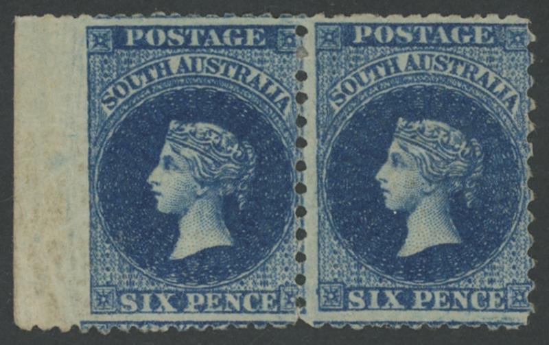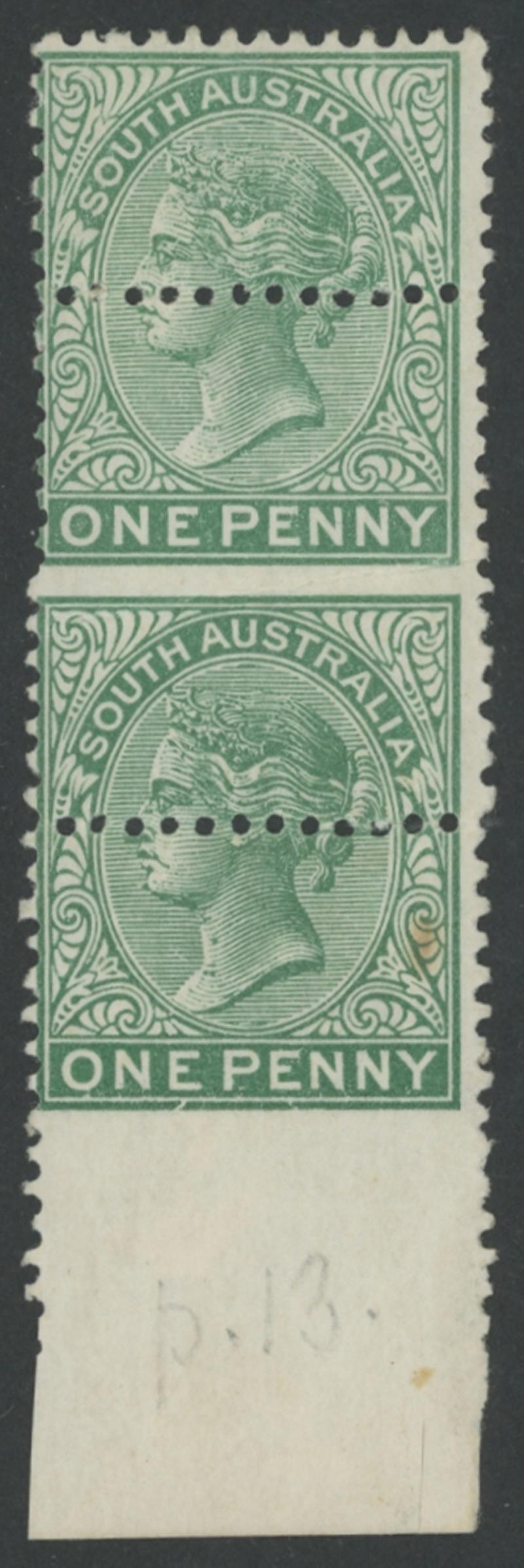 1868-1904 QV De La Rue Crown/Narrow 'SA' Watermark Perf 13 1d blue-green SG 175 marginal vertical pair from the base of the sheet