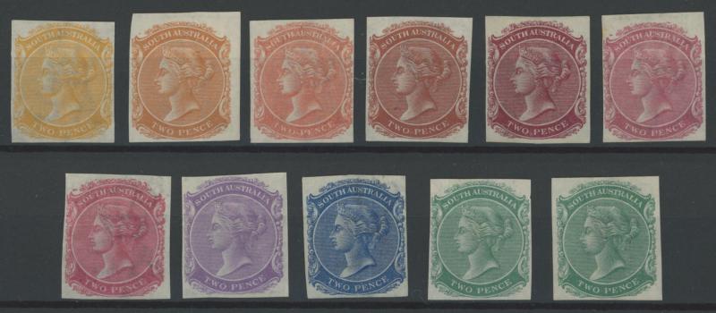 x2, green x3, violet, red/claret x5 (one on bluish paper) or orange x3, very fine to superb. Ex De La Rue Archives.