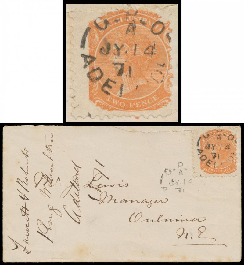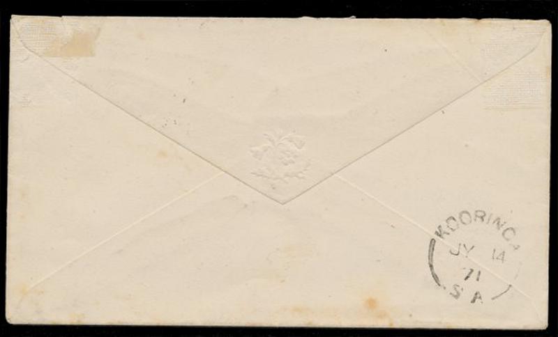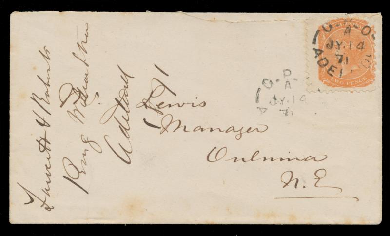 "Oulnina/NE" by 'GPO/ A /JY14/71/ADELAIDE' cds with another strike alongside, 'KOORINGA/JY14/71/SA' arrival backstamp of the same date, neat docketing at left & a couple of very minor blemishes. A rare & desirable First Day Cover. Ex Ron Butler. RPSV