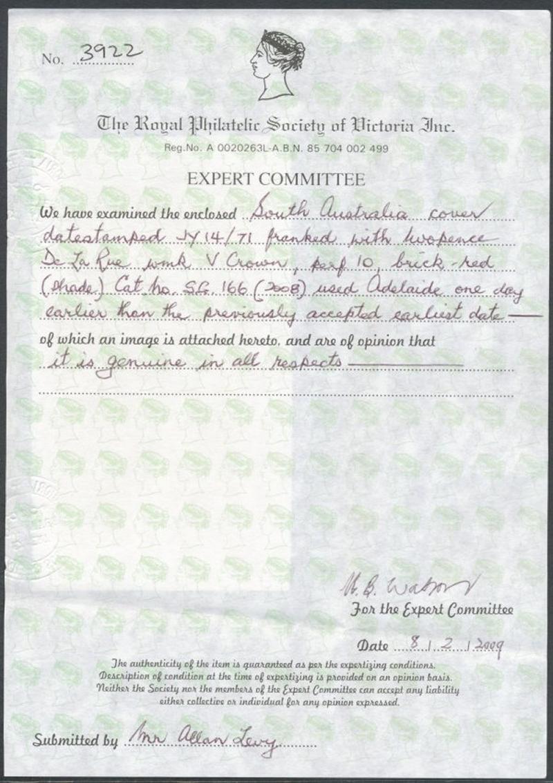 Certificate (2009). Sold at our auction of 11.5.2012 for $1048 (Sale 173 Lot 499). Despite this cover having been known for many years and having received a clear expertising certificate, the date of issue listed in Gibbons is 15.7.1871. (Image1) (Image2)