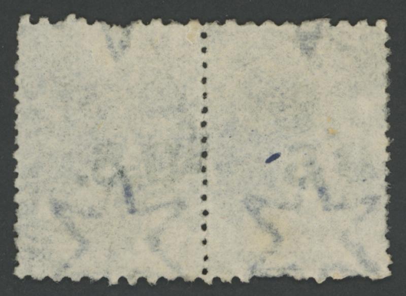 horizontal pair, minor separation faults at upper-left & upper-right, circle-in-bars cancels of the GPO, Cat £800+ for singles. Gary Diffen stated only two pairs & a strip of 3 have been recorded. His very similar but fine pair sold for £456. (Image1) (Image2)