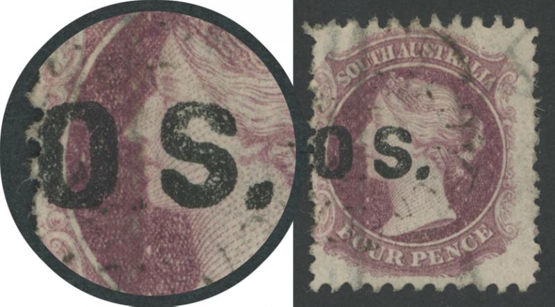 OVERPRINTED THICK 'OS': 1876-85 QV Perkins Bacon Broad Star Wmk Perf 10x11½-12½ 4d plum with No Stop After ‘O ‘ in ‘O S.‘ SG O16b