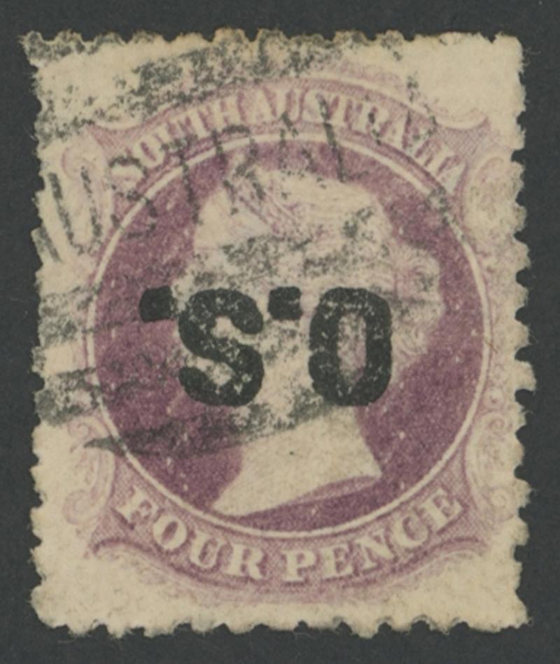 OVERPRINTED THICK 'OS': 1876-85 QV Perkins Bacon Broad Star Wmk Perf 11½-12½ 4d deep mauve with the Overprint Inverted SG O24a,