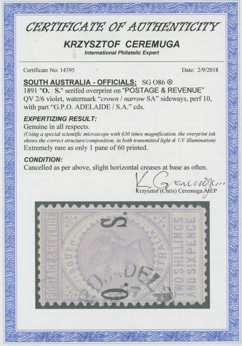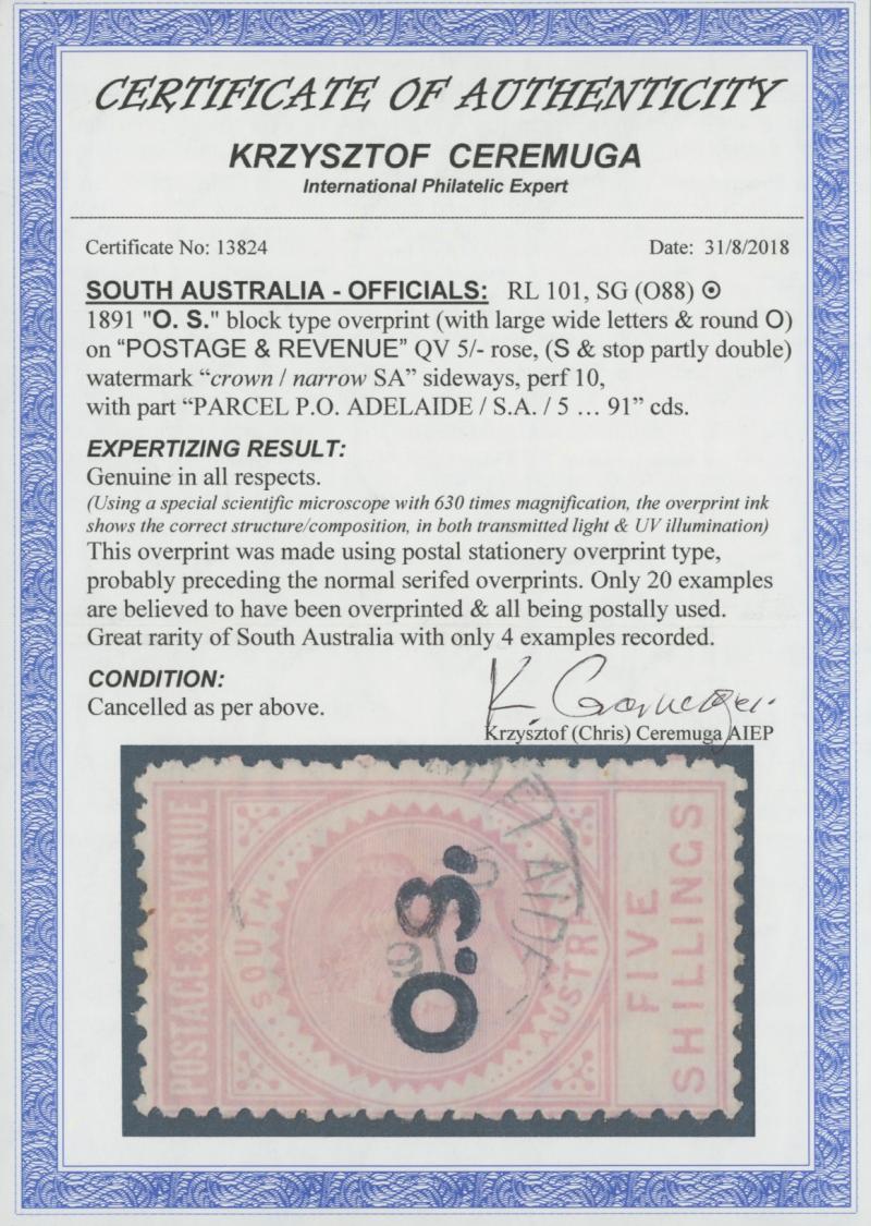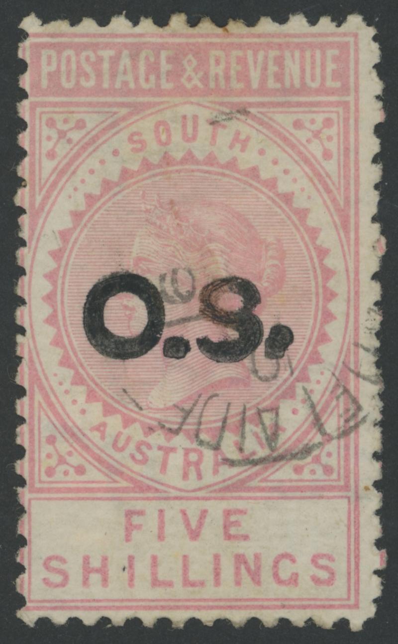 The Block 'O.S.' 5/- is one of the great unrecognised rarities of Australian Colonies philately. It is believed that only 20 stamps were overprinted, of which four have survived, all of which exhibit similar centring, and all of which are cancelled