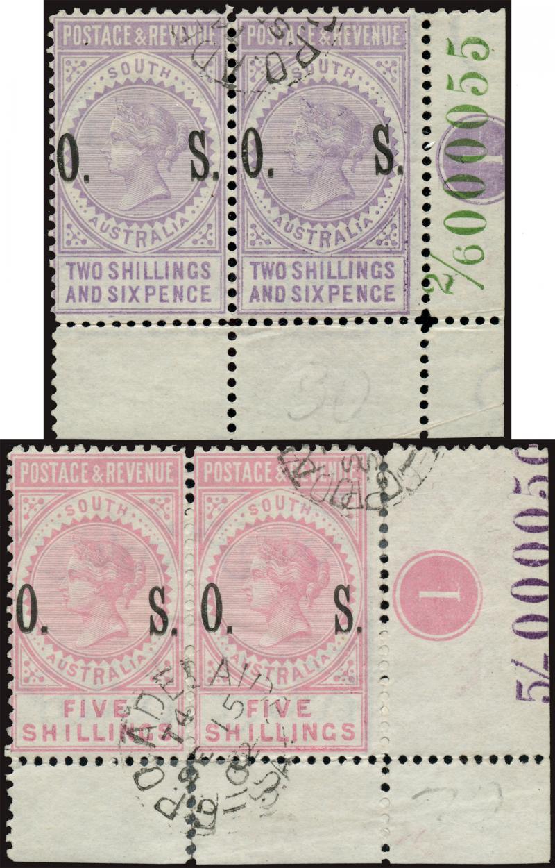 rose-pink SG O86-87 lower-right corner pairs each with Plate Number '1' and Value/Sheet Numbers '2/6 000055' in Green or '5/- 000050' in Violet, light horizontal bends, CTO with 'GPO ADELAIDE/ T4 /SE15/02/S.A' cds, Cat £28,000+ for normal singles. Ex