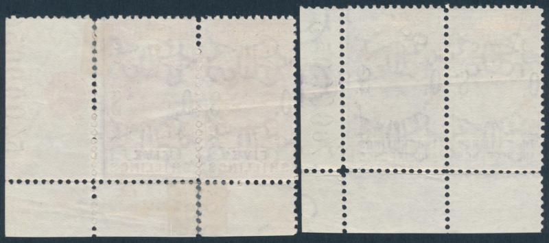 Vermilion, 1d block of 4 with solid jubilee line at the top with large-part '1d 316---' in Black; 2d violet Plate Number '3' strips of 4 with '2d 837225' in Vermilion or '2d 800176' in Black both with Double Punctures; and Tannenberg 5d brown-purple