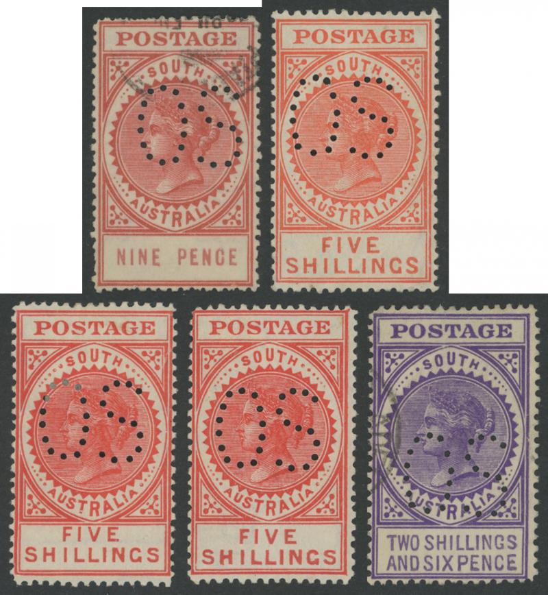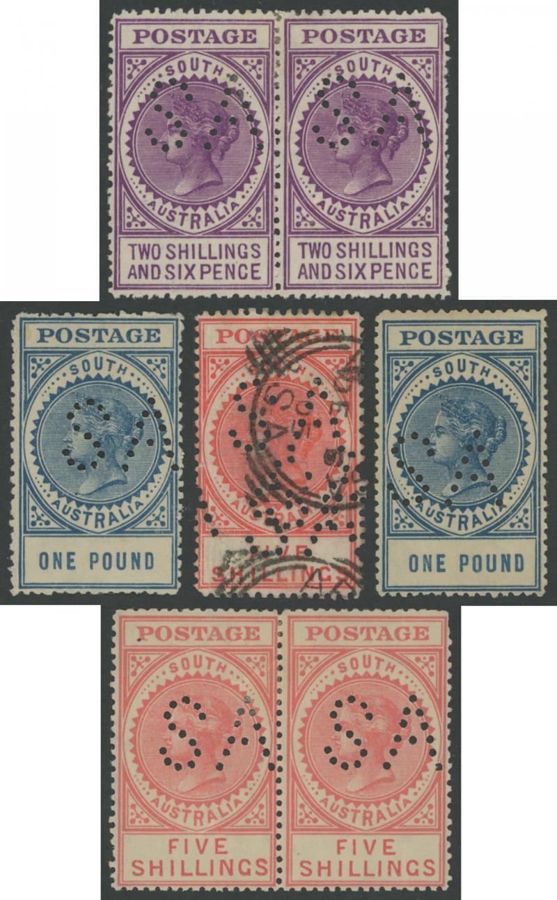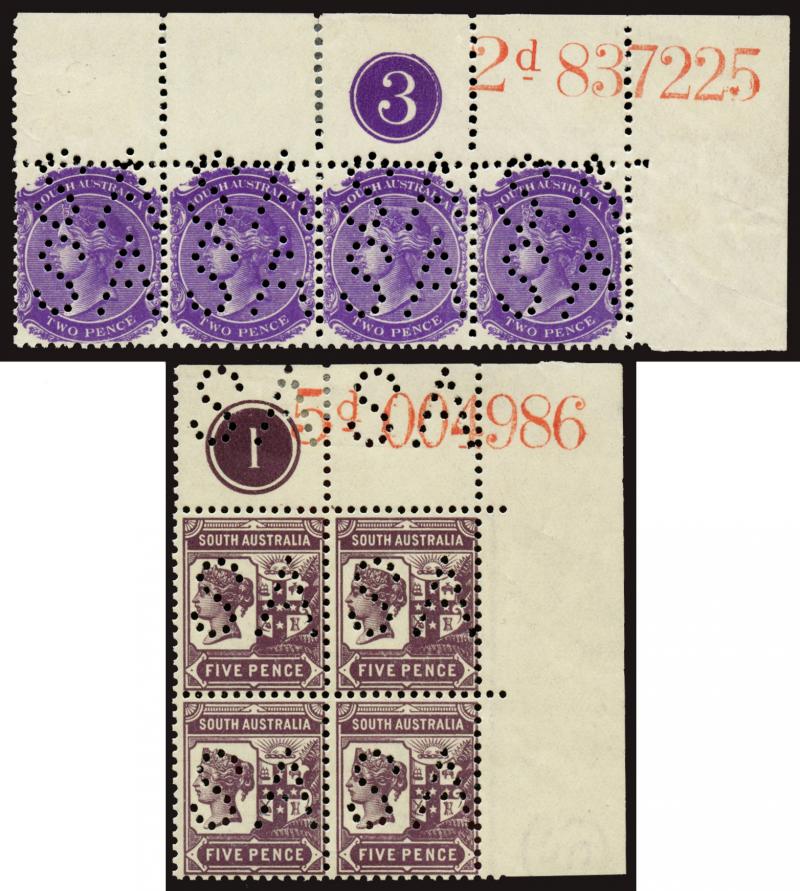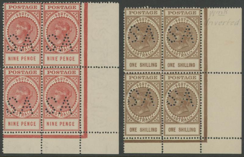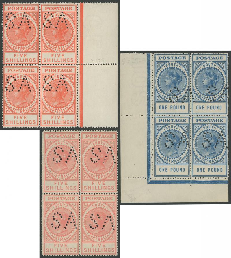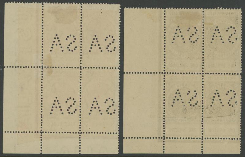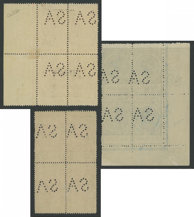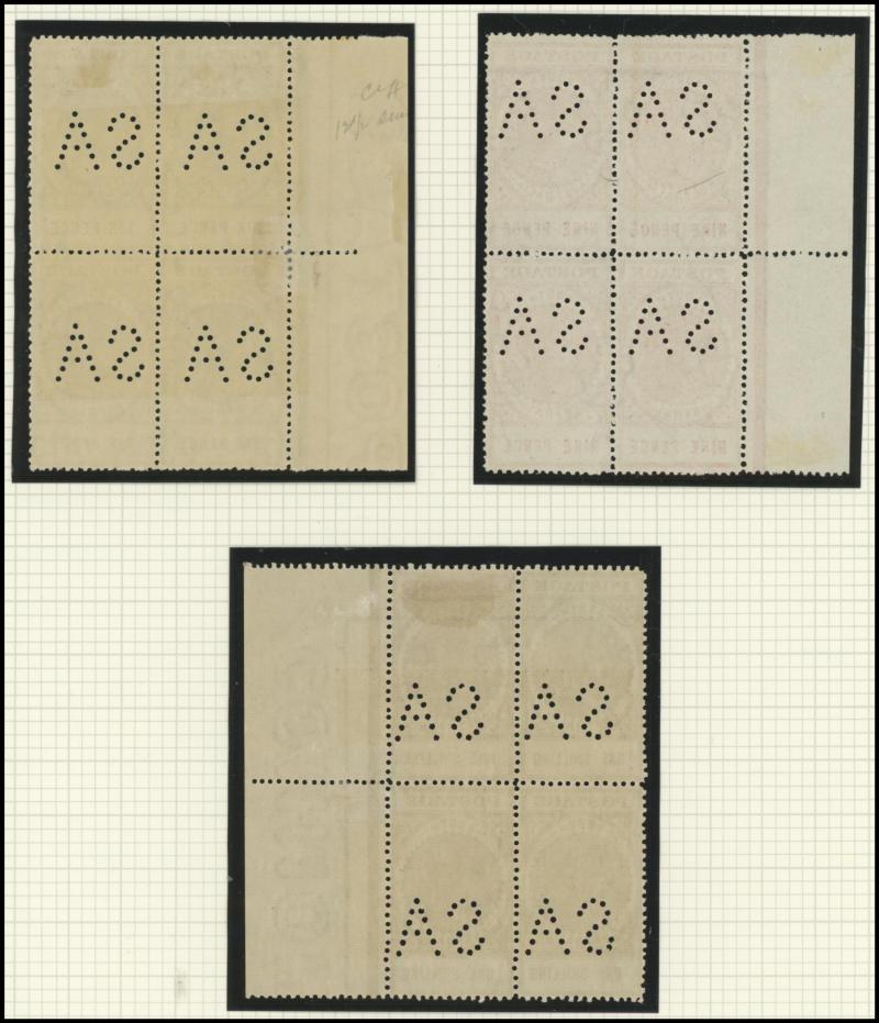 Upper Units, 2½d block of 4 with Double 'SA' on the Lower Units and 5d Plate Number '1' block of 4 with Double 'SA' on the Upper Units and in the Upper Margin, etc, also punctured 'OS' ½d x3 (one mint), 1d x5 (one mint) & 2½d mint.