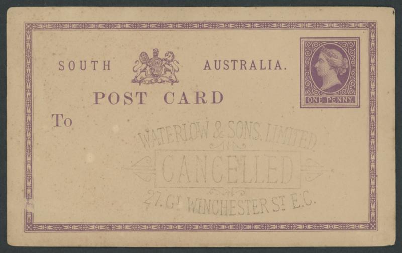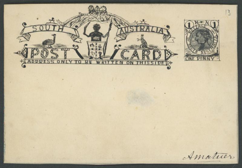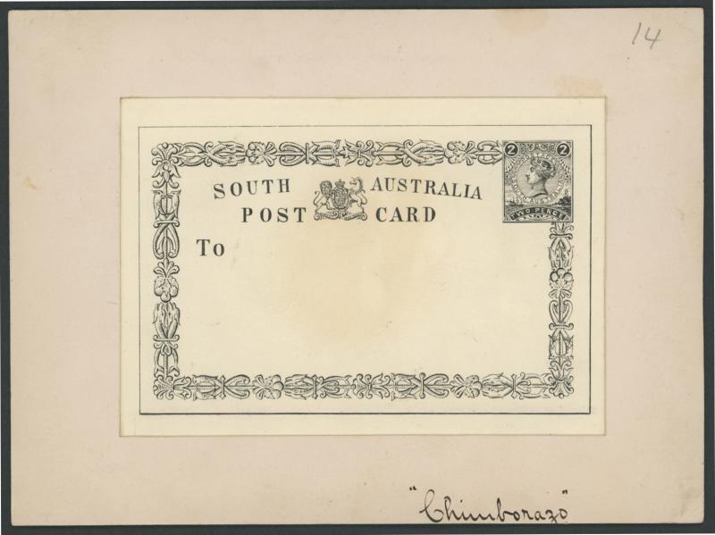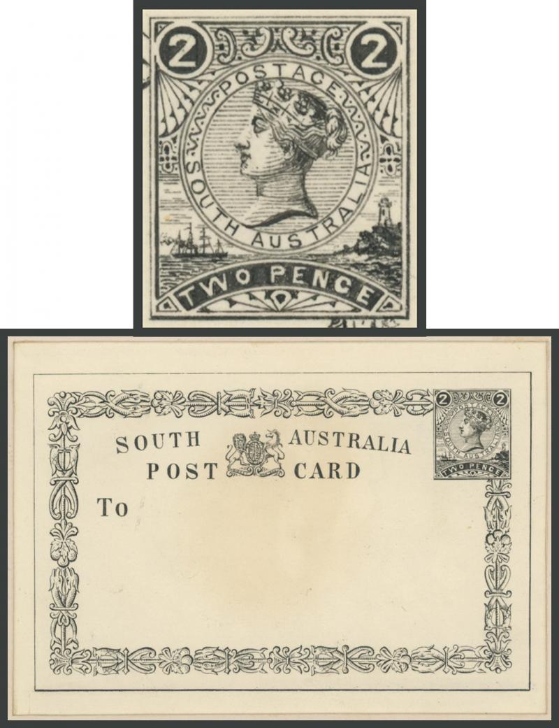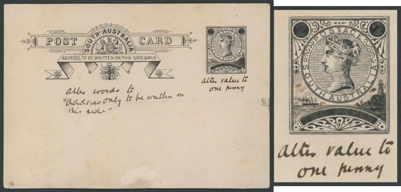 Lot 719). A highly significant essay, directly related to both the issued design, and the subsequent Commonwealth Postal Cards that employed a revised form of the South Australian header. (Image1) (Image2)