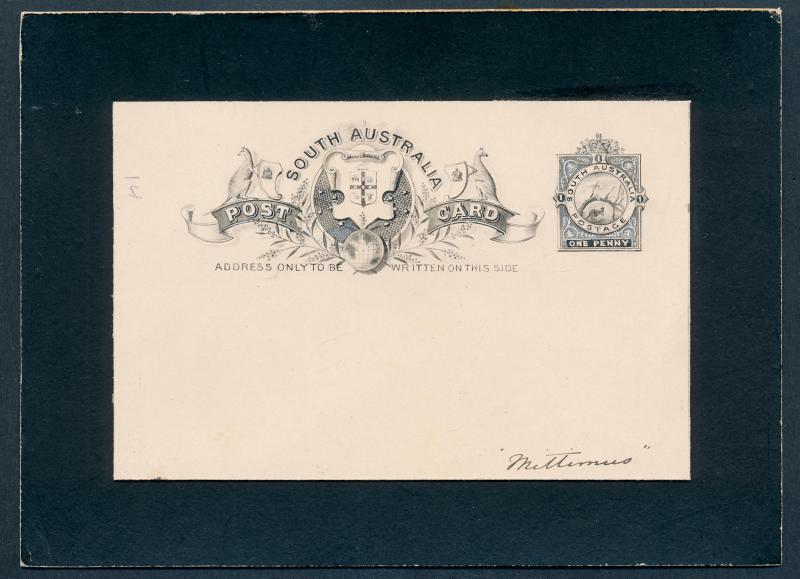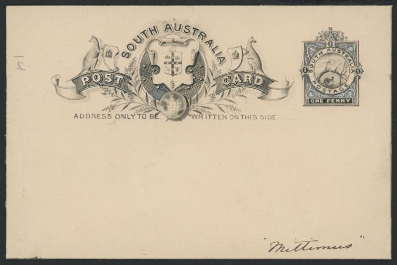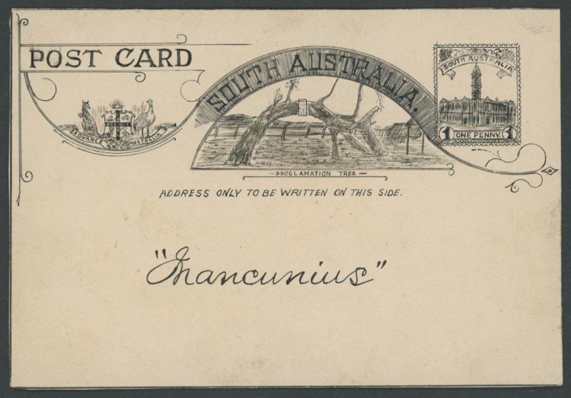 Post Office 1d issue with 'POST CARD SOUTH AUSTRALIA' heading and Coat of Arms with Kangaroo & Emu at left and the Proclamation Tree at Glenelg between this and the value at top, the artist's pseudonym "Mancunius" at centre, minor blemishes and a