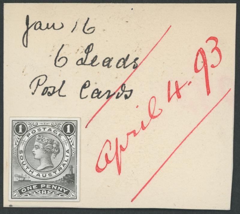 printer's daybook (66x59mm) endorsed "Jan 16/6 Leads/Postal Cards" &, in red, "April 4 93". Ex Martin Walker/Nelson Eustis: sold at our auction of 12.5.2007 for $1340 (Sale 128 Lot 559). Don Pearce's two similar proofs each sold for $455 (Sale 249