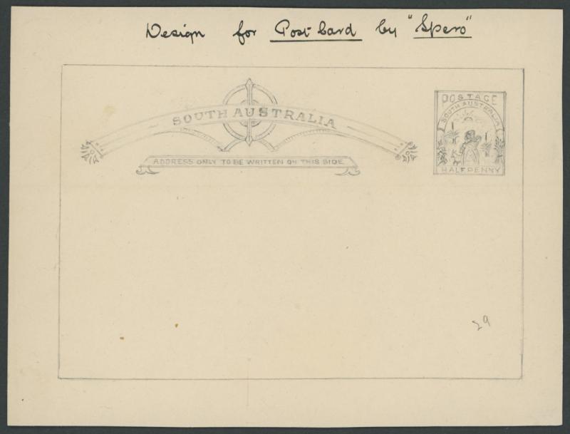 with 'SOUTH AUSTRALIA' ornate curved heading, not including the word 'Postcard' but endorsed at top "Design for Postcard by Spero" (artist's pseudonym), minor blemishes and a small adhesion spot on the reverse where removed from a backing page. (Image1) (Image2)