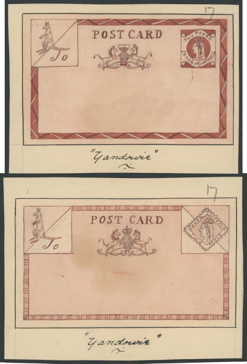 heading above Coat of Arms comprised of a Lion & Unicorn and Kangaroo at left, two slightly different designs with 'SOUTH AUSTRALIA' & 'TWO PENCE' either above or below the value indicia, the artist's pseudonym "Yandowie" at the base of each, minor