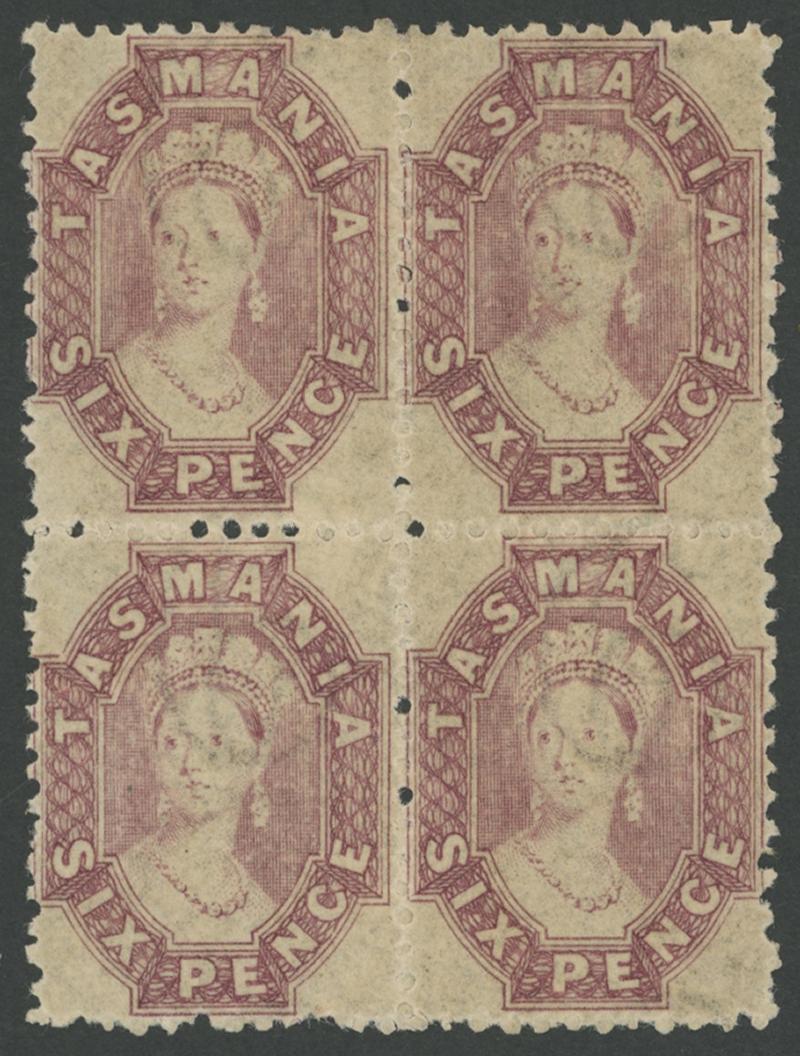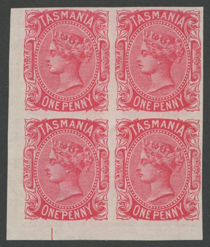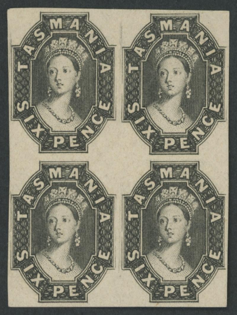 1858 QV Perkins Bacon Chalons 'TASMANIA' London Printings 6d plate proof block of 4 in black on ungummed unwatermarked paper,