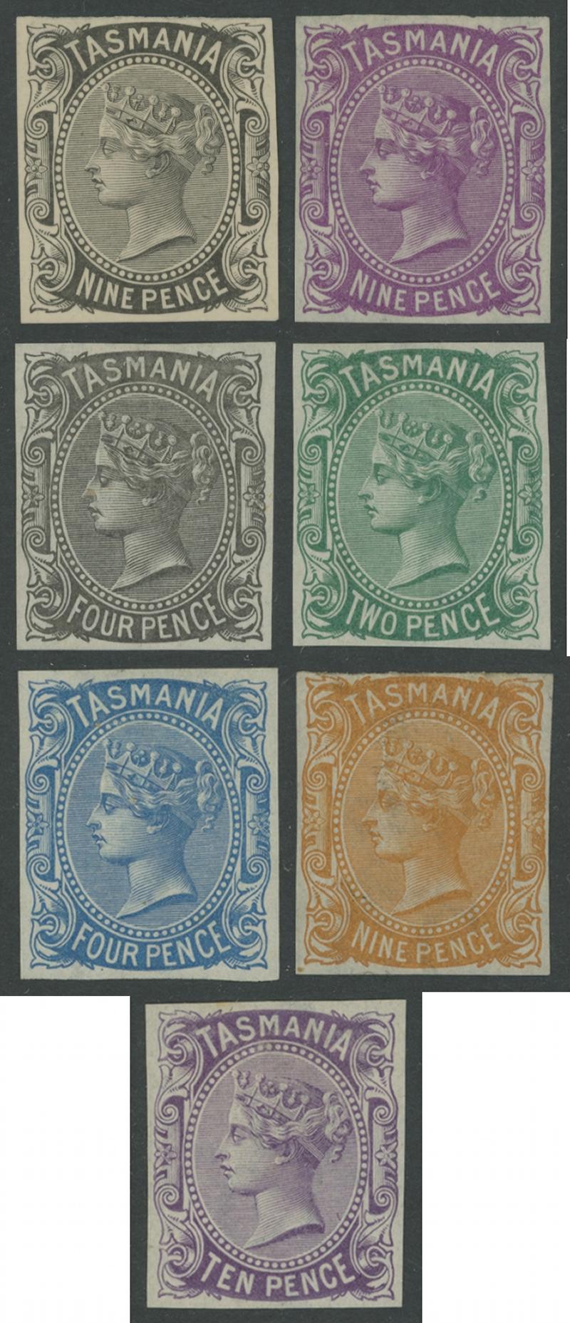 purple and with Crown/CC Watermark 4d in black, 2d green & 4d blue in close to the issued colours, 9d in ochre-orange & 10d in slate-violet, part to large-part gum. (7) (Image1) (Image2)