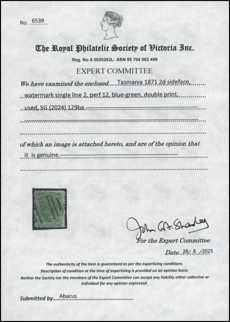 SG 129ba, neat 'TASMANIA'-in-bars cancel of Hobart, unpriced (the Perf 11½ Double Print Cat £1800). Ex Jack Shatsis. RPSV Certificate (2025). A very fine example of this famous error. This is the stamp illustrated on the cover of 'The Australian