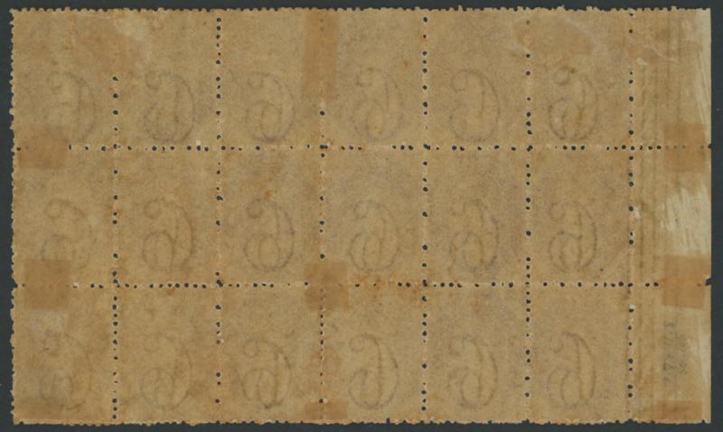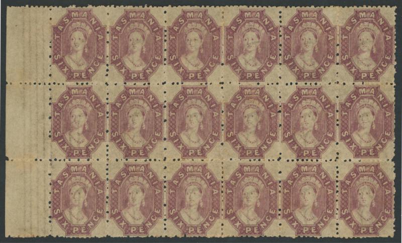 1871-91 QV Perkins Bacon Chalons Hobart Printings Double-Lined Numeral Wmk Perf 12 6d dull claret SG 143 marginal block of 18 (6x3)