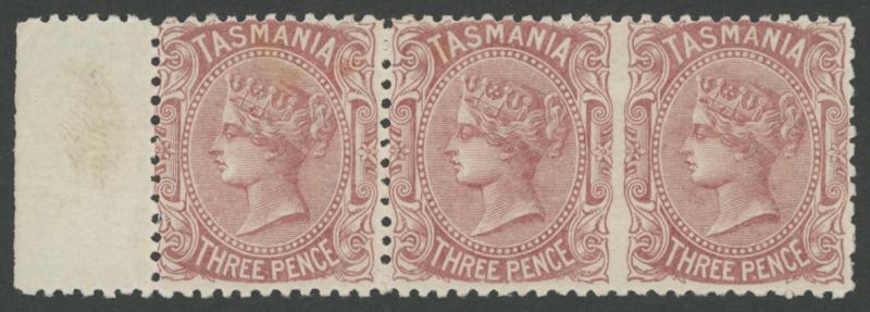 1871-78 QV Sidefaces Hobart Printings 'TAS'-with-Lines Watermark Perf 11½ 3d pale red-brown horizontal strip of 3 from left of the
