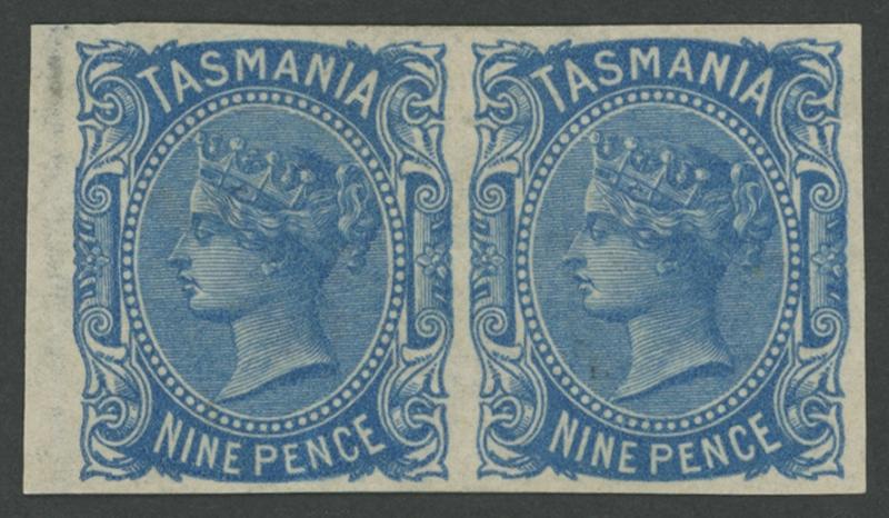 1871-78 QV Sidefaces Hobart Printings 'TAS'-with-Lines Watermark QV 9d blue Imperforate Pair SG 148a, margins good to large,