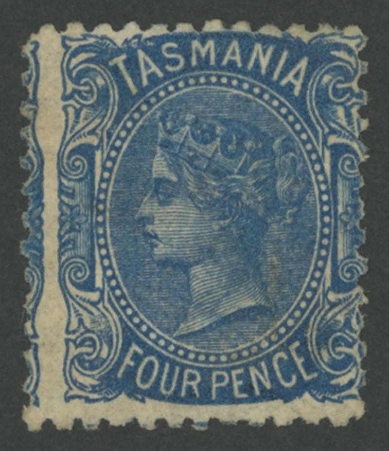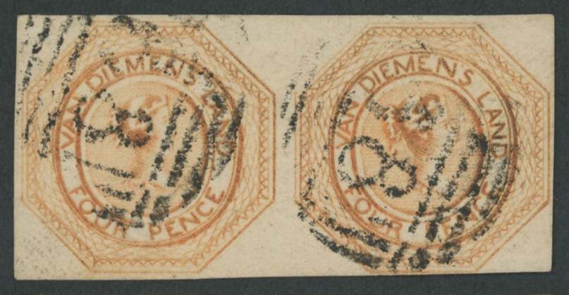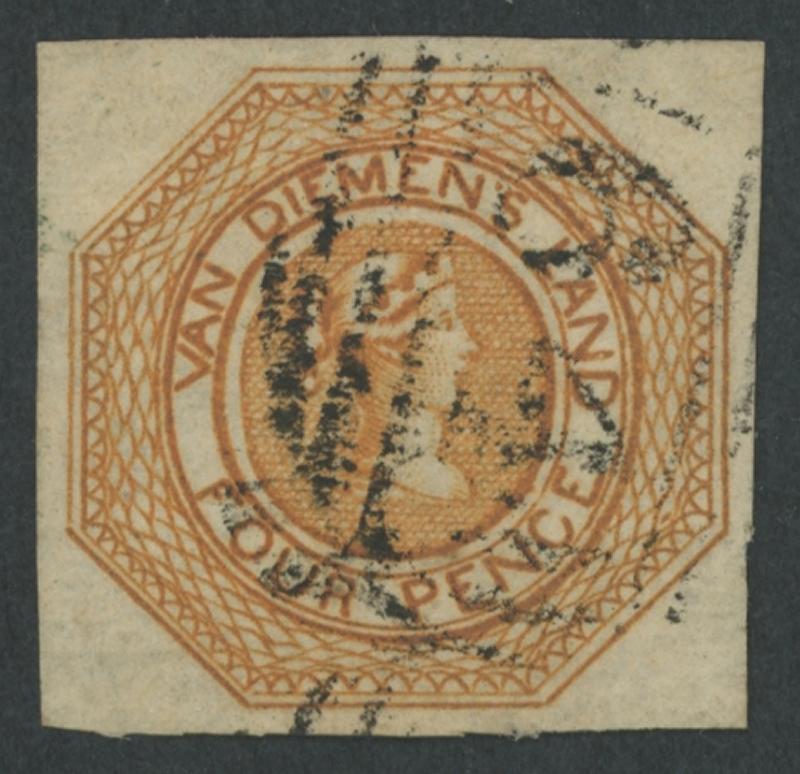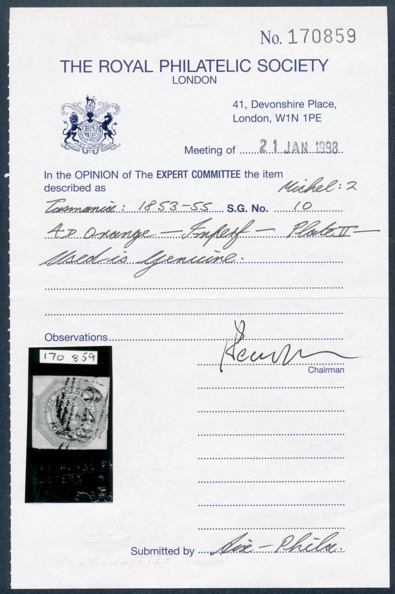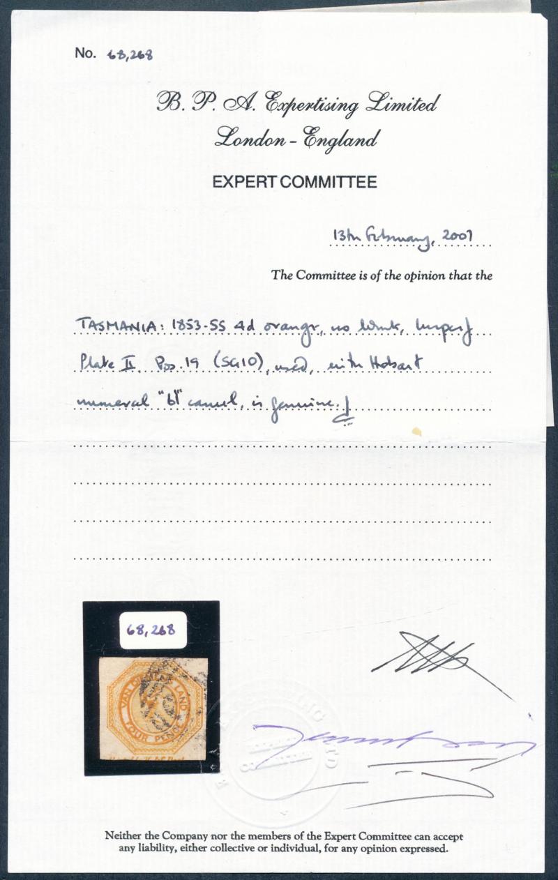 Hobart, Cat £375 (US$425). RPSL Certificate (1998) states "SG No. 10 ... 4d orange" (Cat £425), but this is definitely the 'dull' shade. A premium example. (Image1) (Image2)