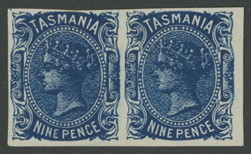 1896 QV Sidefaces Hobart Printings 'TAS' without Bars Wmk QV 9d imperf plate proof pair in indigo on ungummed unwatermarked paper,