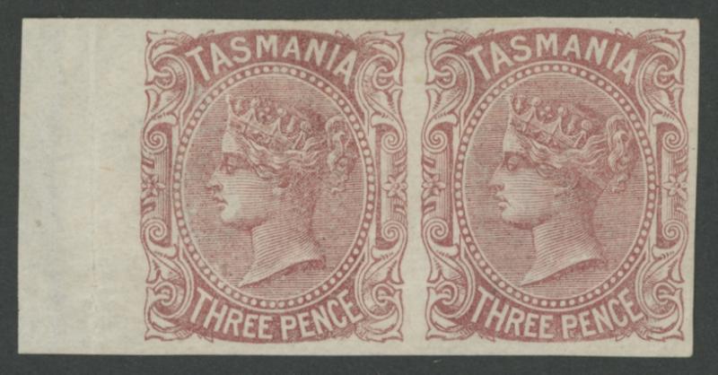 1880-91 QV Sidefaces Hobart Printings 'TAS'-without-lines Watermark Perf 11½ 3d red-brown Imperforate Pair SG 161a from the left of