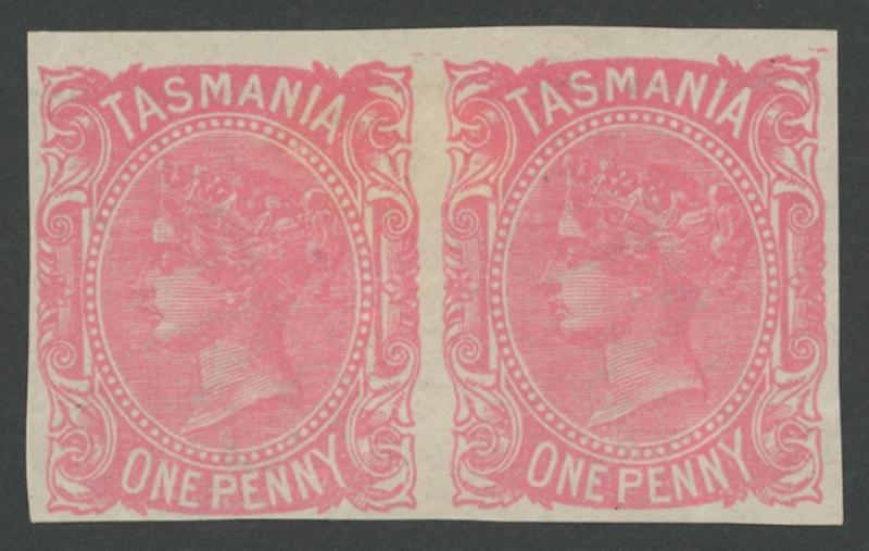 1880-91 QV Sidefaces Hobart Printings 'TAS'-without-lines Watermark Perf 12 1d pink Imperforate Pair SG 164a, margins close to