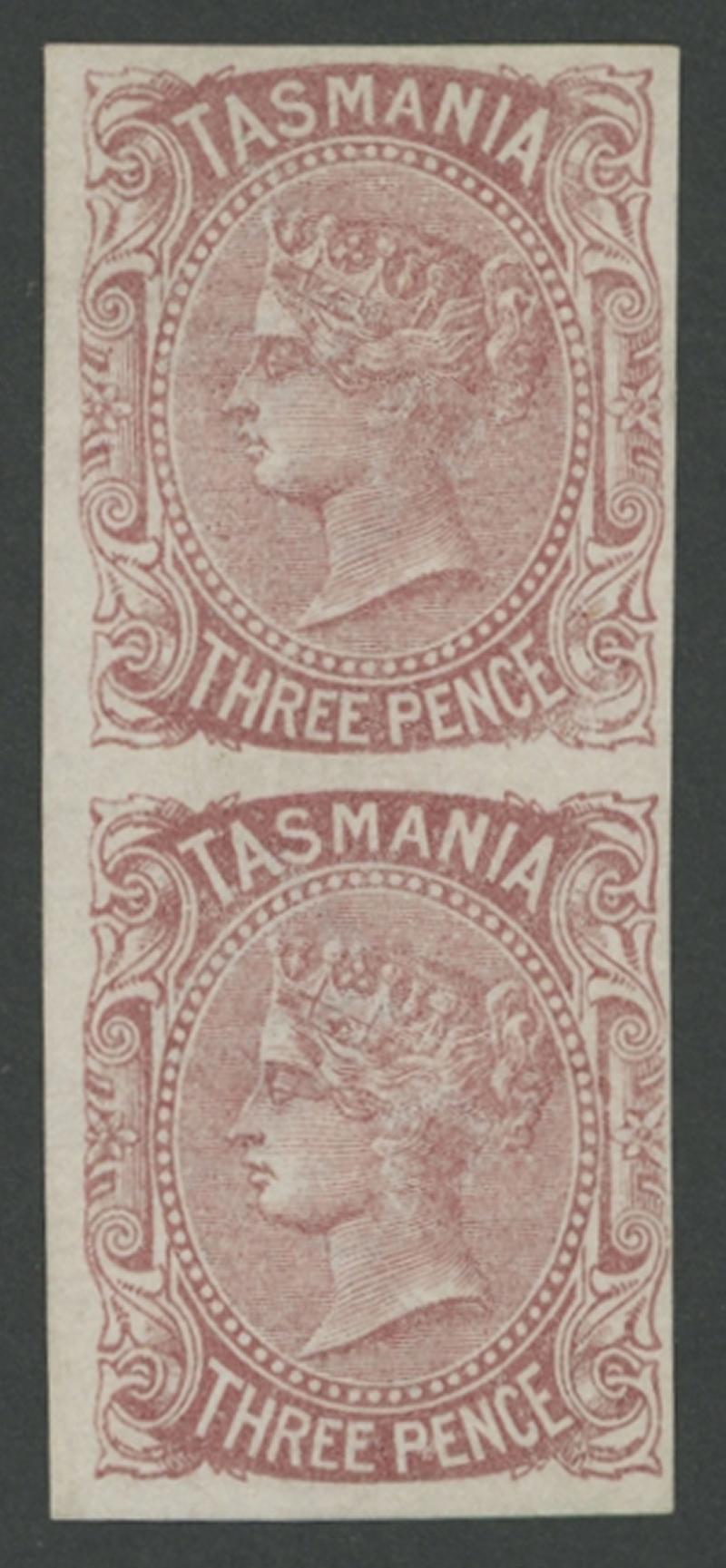 1880-91 QV Sidefaces Hobart Printings 'TAS'-without-lines Watermark Perf 11½ QV 3d red-brown vertical Imperforate Pair SG 161a,