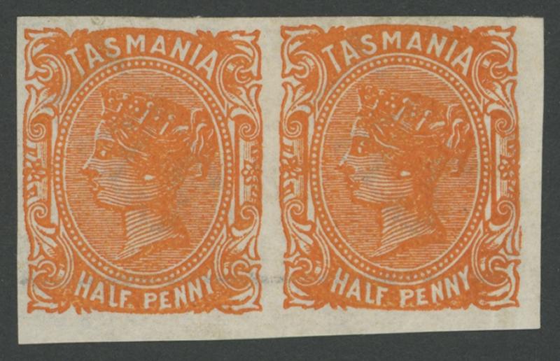 1891 QV Sidefaces Hobart Printings 'TAS'-without-Bars Wmk Perf 12 ½d orange Imperforate Pair SG 172a from the lower-right of the