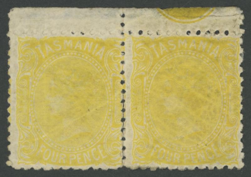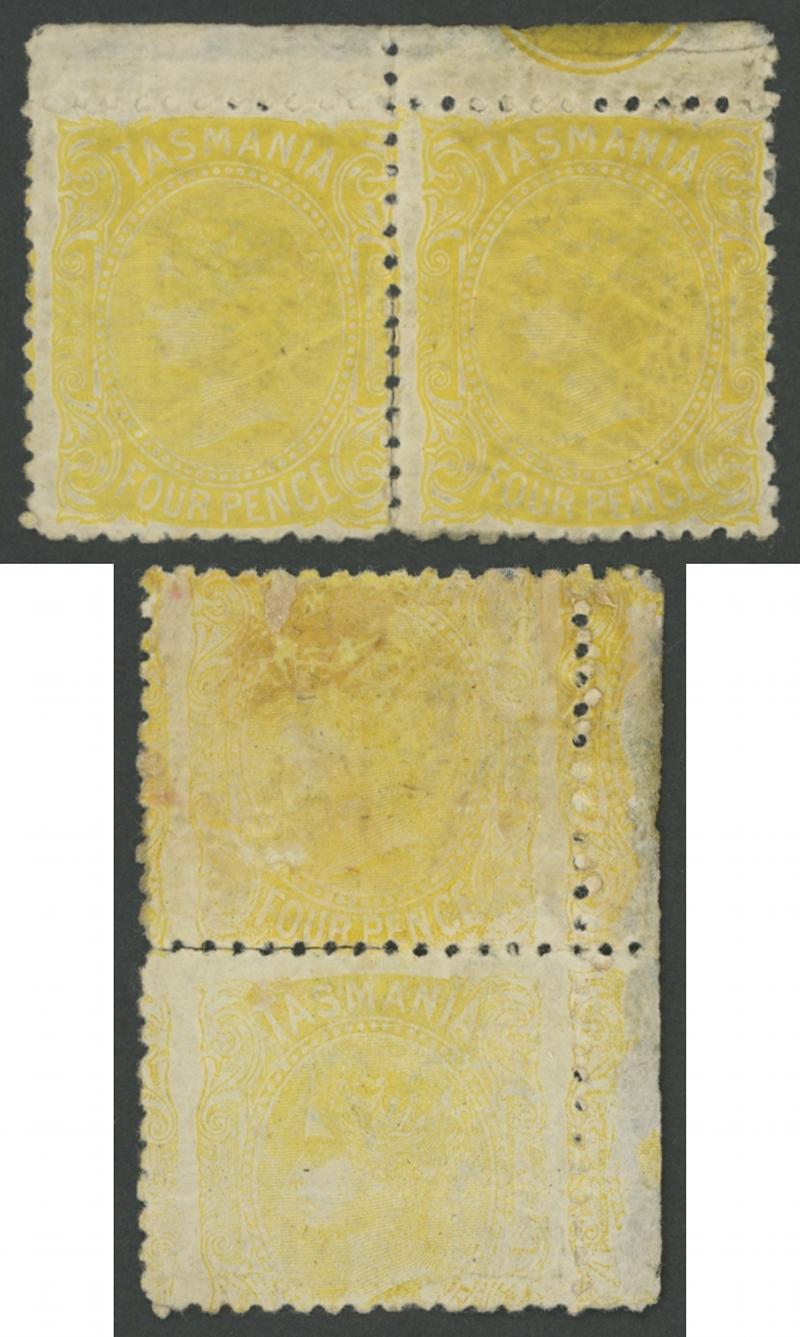 impression on the 'reverse' being Sideways) SG 166ab marginal pair from the top of the sheet, the original impression is sharper than usual with the central 'FOUR PENCE/TASMANIA' being easily read, the left-hand unit creased and minor gumside