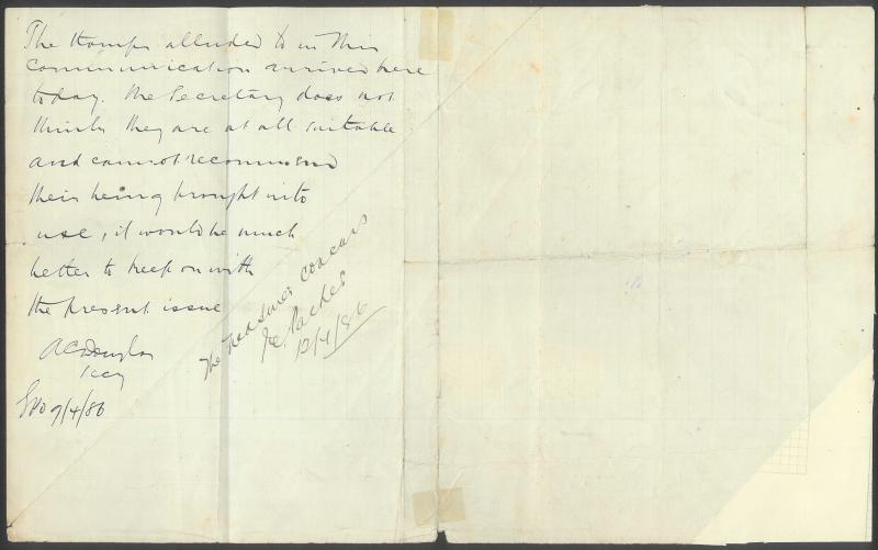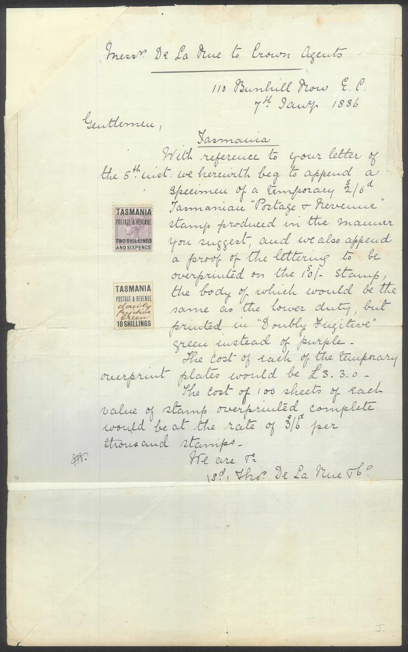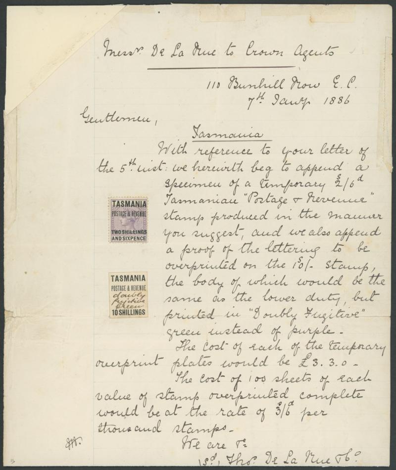 The Colonial Agents requisitioned stamps of these values from De La Rue. However, in 1882 Tasmania had authorised postal use of revenue stamps printed in the Colony. Hobart advised the Crown Agents that the proposed stamps would be "useless". They