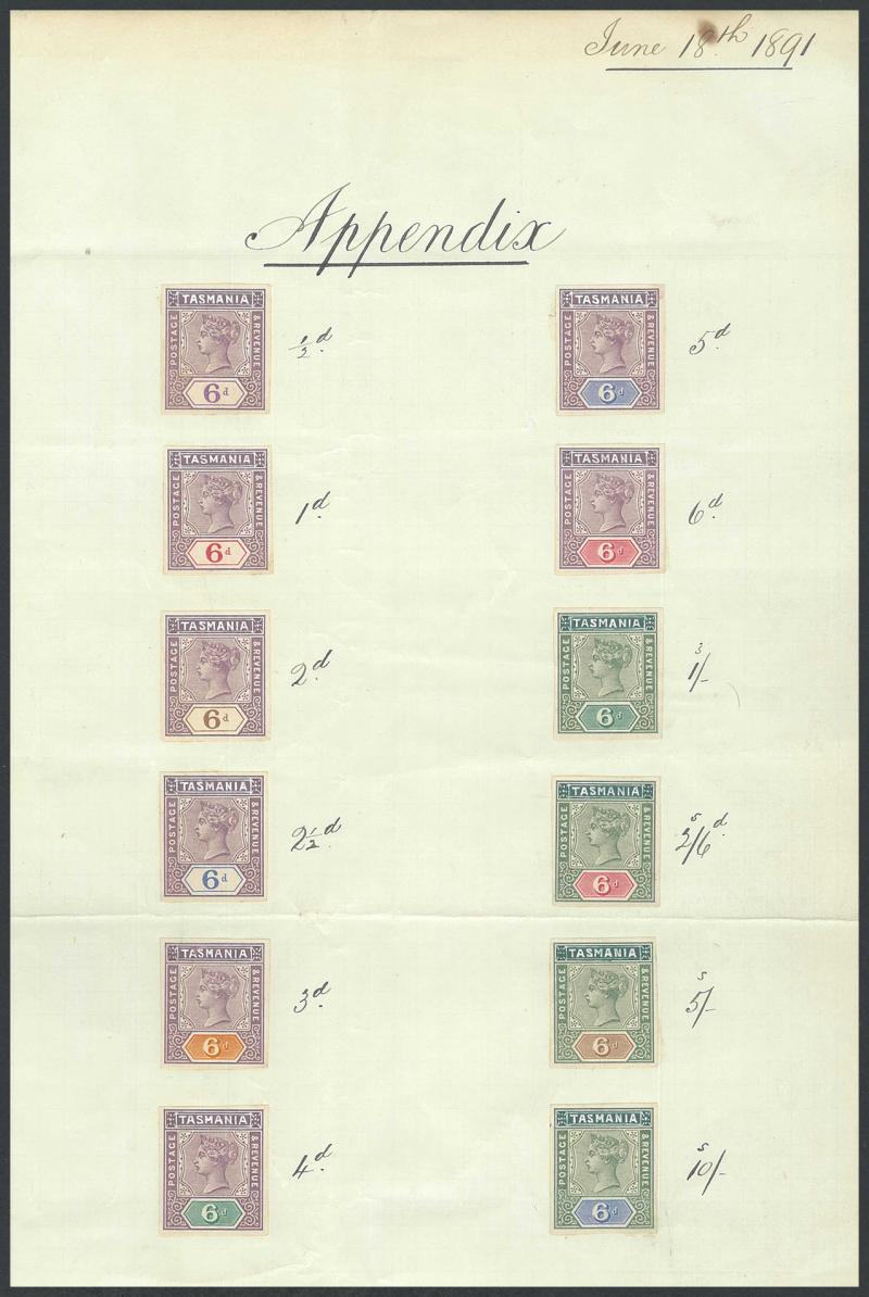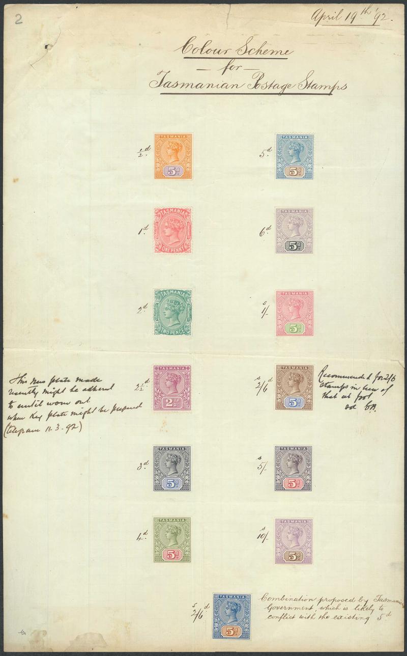 1892-99 QV De La Rue Tablets 'Colour Scheme/for/Tasmanian Postage Stamps' Appendix Sheet dated "April 19th 92" (203x330mm) with