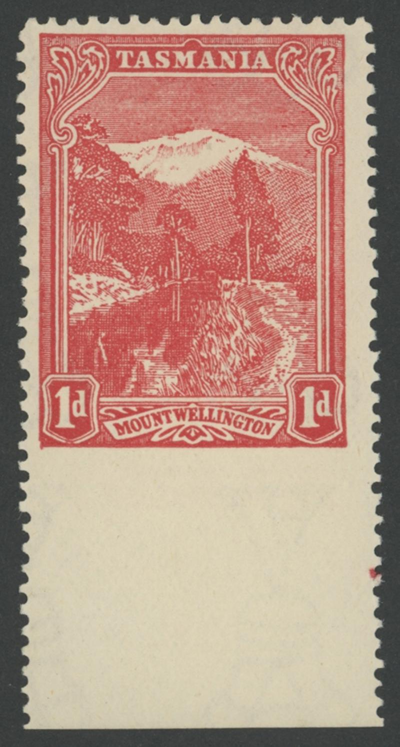 Imperforate at Base ACSC T16ba (formerley T14ba), Perforation Guideline Dot in the lower margin, full gum other than a small hinge remainder, Cat $1250. The ACSC states that "Possibly only one sheet was issued imperforate at base, in the carmine-red