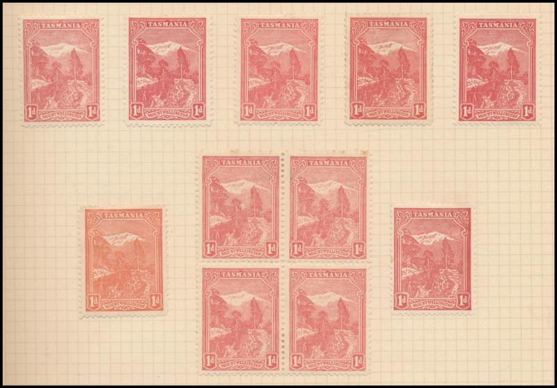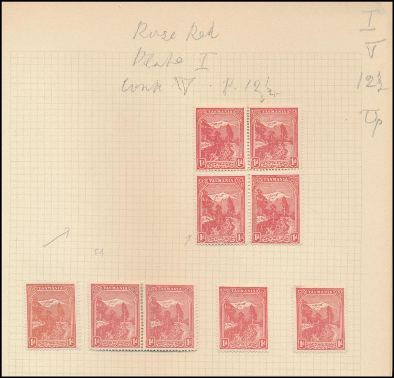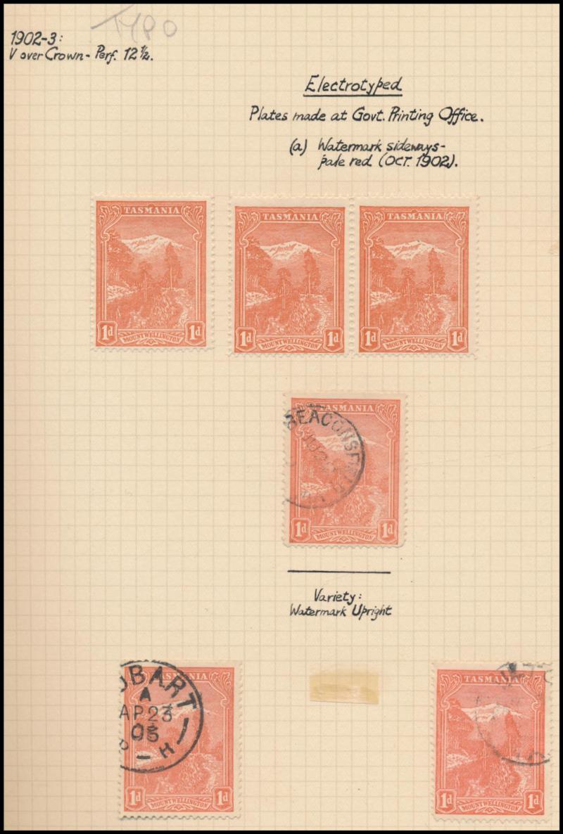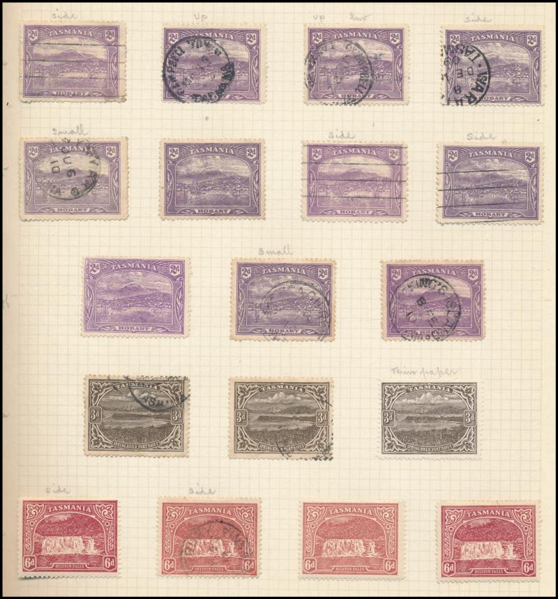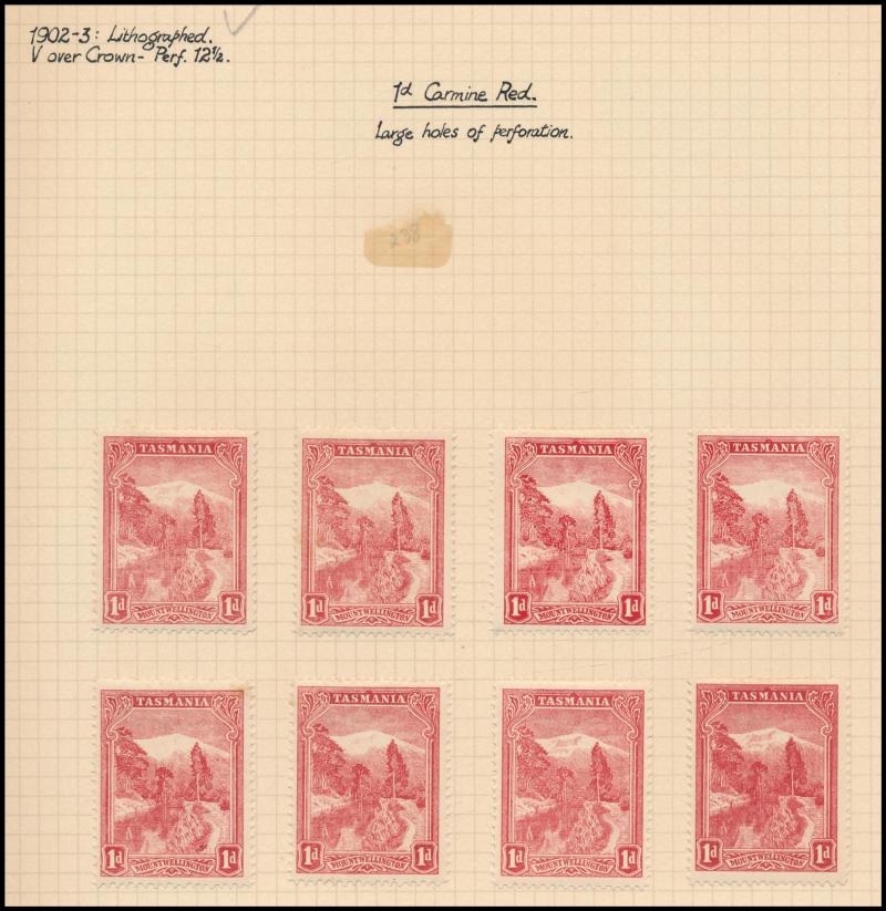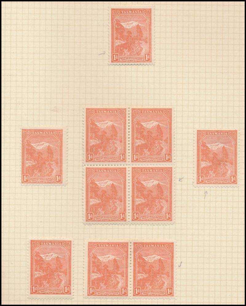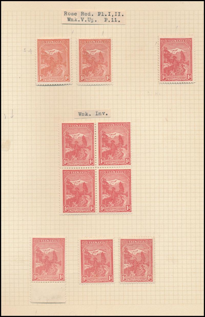issued 1d 2d 2½d & 5d stamps plus eight different imperforate 5d colour trials with Lined Field in colours adopted for the ½d 6d 1/- 2/6d 5/- & 10/- plus for a proposed but unissued 3d & 4d, and an alternative for 2/6d as requested by the Tasmanian