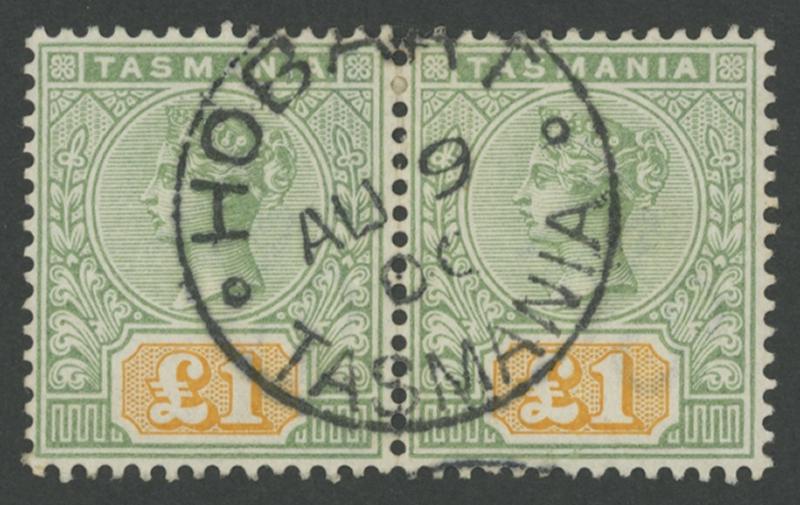 1892-99 QV De La Rue Tablets £1 green & yellow SG 225 horizontal pair, excellent colours, well-centred, very fine central Hobart