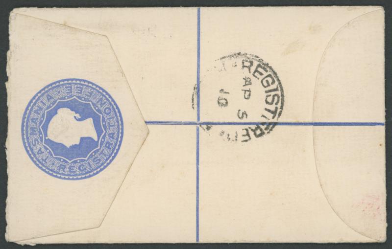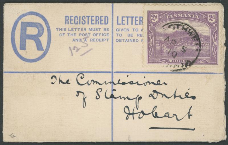 2d Pictorial tied by 'BOTHWELL/AP5/10' cds, 'REGISTERED/ HOBART' arrival backstamp, Bothwell R label removed otherwise superb. A rare & highly significant item, being the smallest Registration Envelope issued in the British Empire. Illustrated above