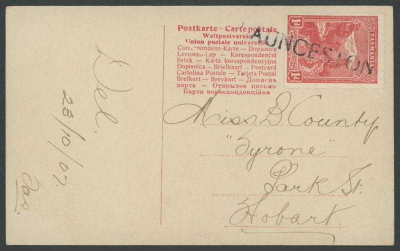 Launceston: undated straight-line '[L]AUNCESTON' largely very strike tying 1d Pictorial to a PPC with briefest message dated