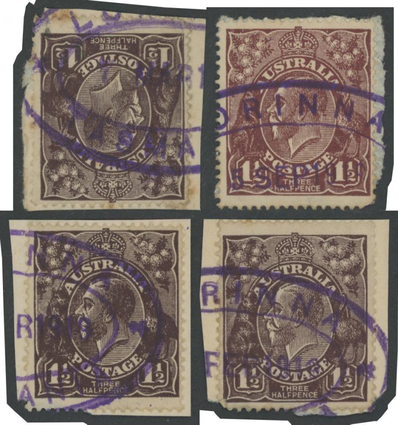 Lorinna: double-oval 'LORINNA/ * TASMANIA * ' in violet, four superb identifiable part-strikes with 1919 dates on KGV 1½d browns.